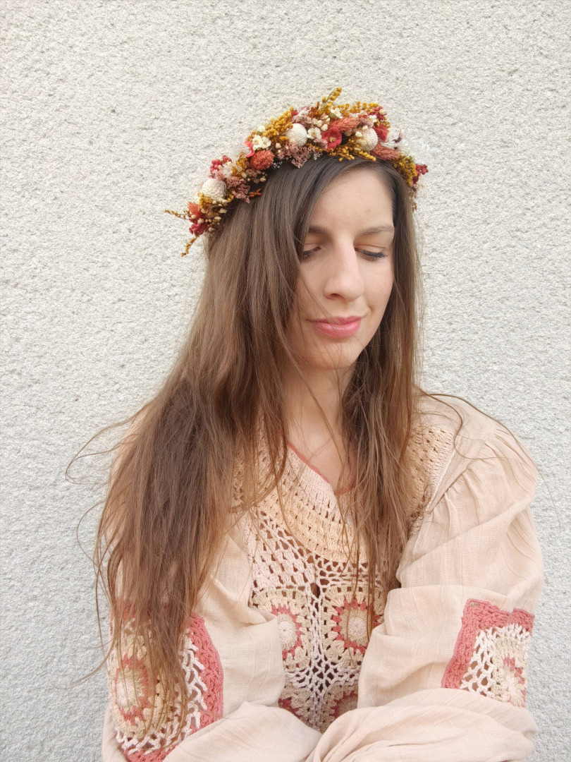 The half wreath is made of artificial flowers, preserved material, wire and other trinkets intended for arranging. Suitable for weddings or everyday use :) It's a fragile natural material, it can fall slightly, especially during transport. But it is not a fault of the product