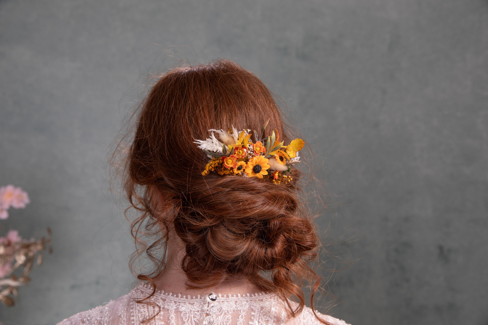 Romantic wedding flower hair comb in yellow and orange tones with sunflower...