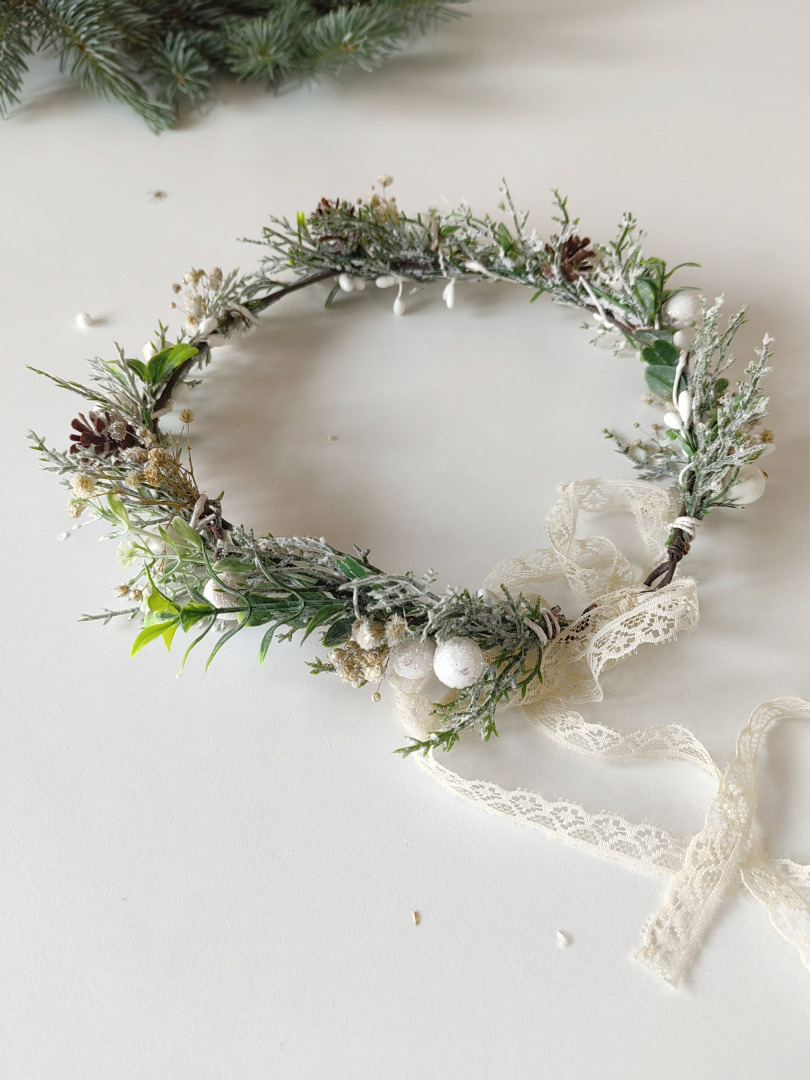 The flower hair wreath is made of artificial flowers, grass, mistletoe, preserved baby's breath and other arranging material.