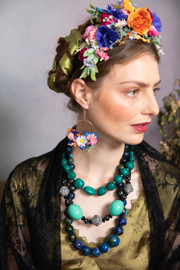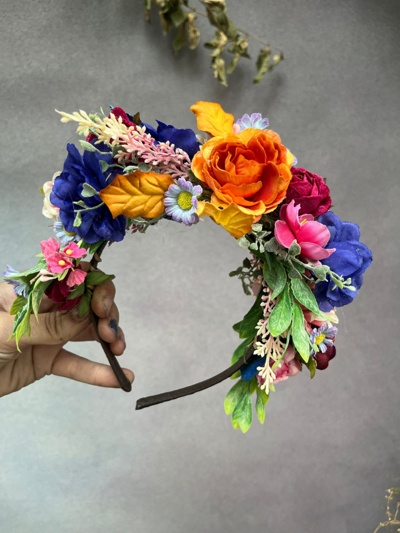 Veľká kvetinová čelenka v boho štyle inšpirovaná mexickou umelkyňou Fridou Kahlo. Čelenka je obojstranná a môžete ju nosiť z oboch strán. Vhodná predovšetkým na vypnuté účesy. Určená na boho svadbu,svadbu na záhrade,ale aj na špeciálne príležitosti ako je Halloween,letný festival či doplnok k líčeniu v Muerta štyle.