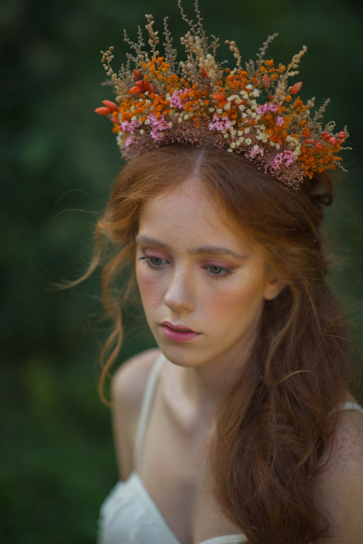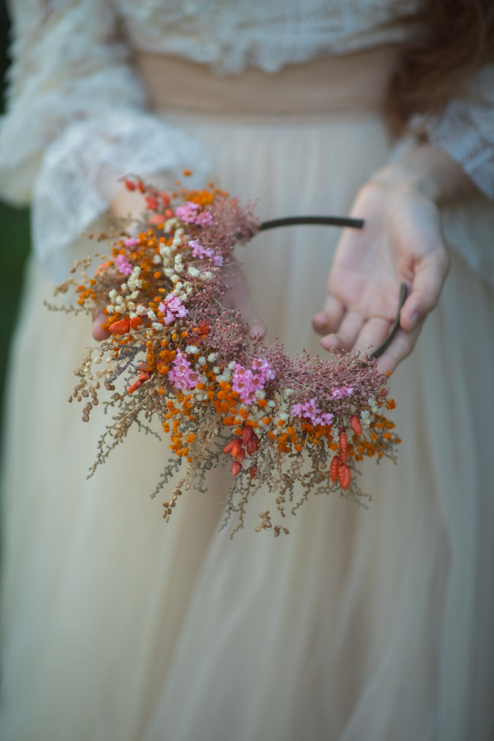 The flower headband is made of natural preserved and dried leaves, grass and other trinkets used for arranging.