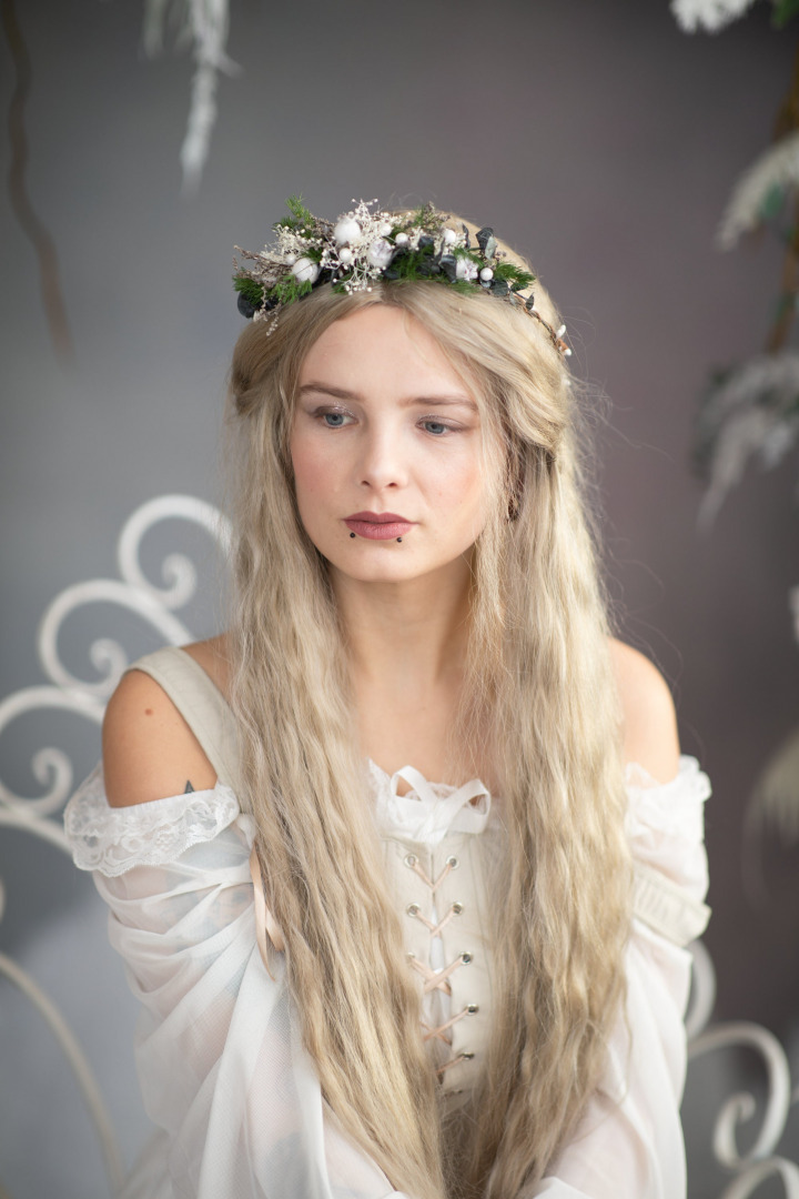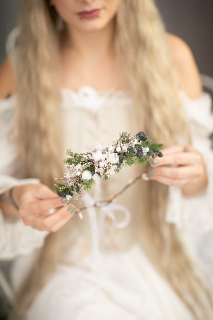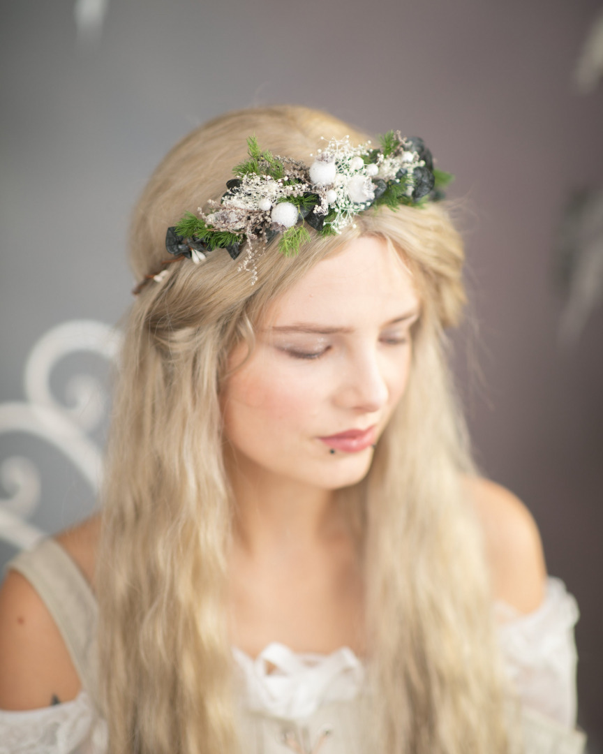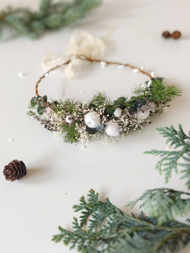 The flower hair wreath is made of artificial flowers, grass, leaves and other arranging material.