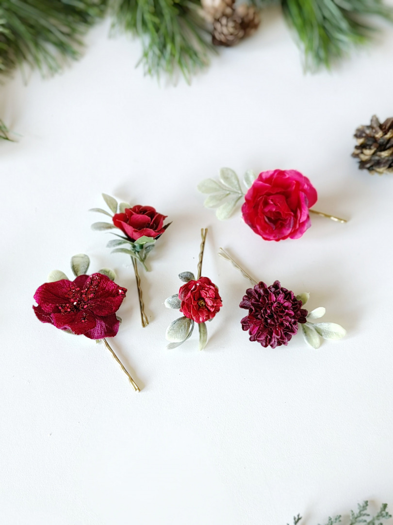 The hair clips are made of artificial and preserved flowers, leaves, gingerbread, floristic tape and other arranging material.