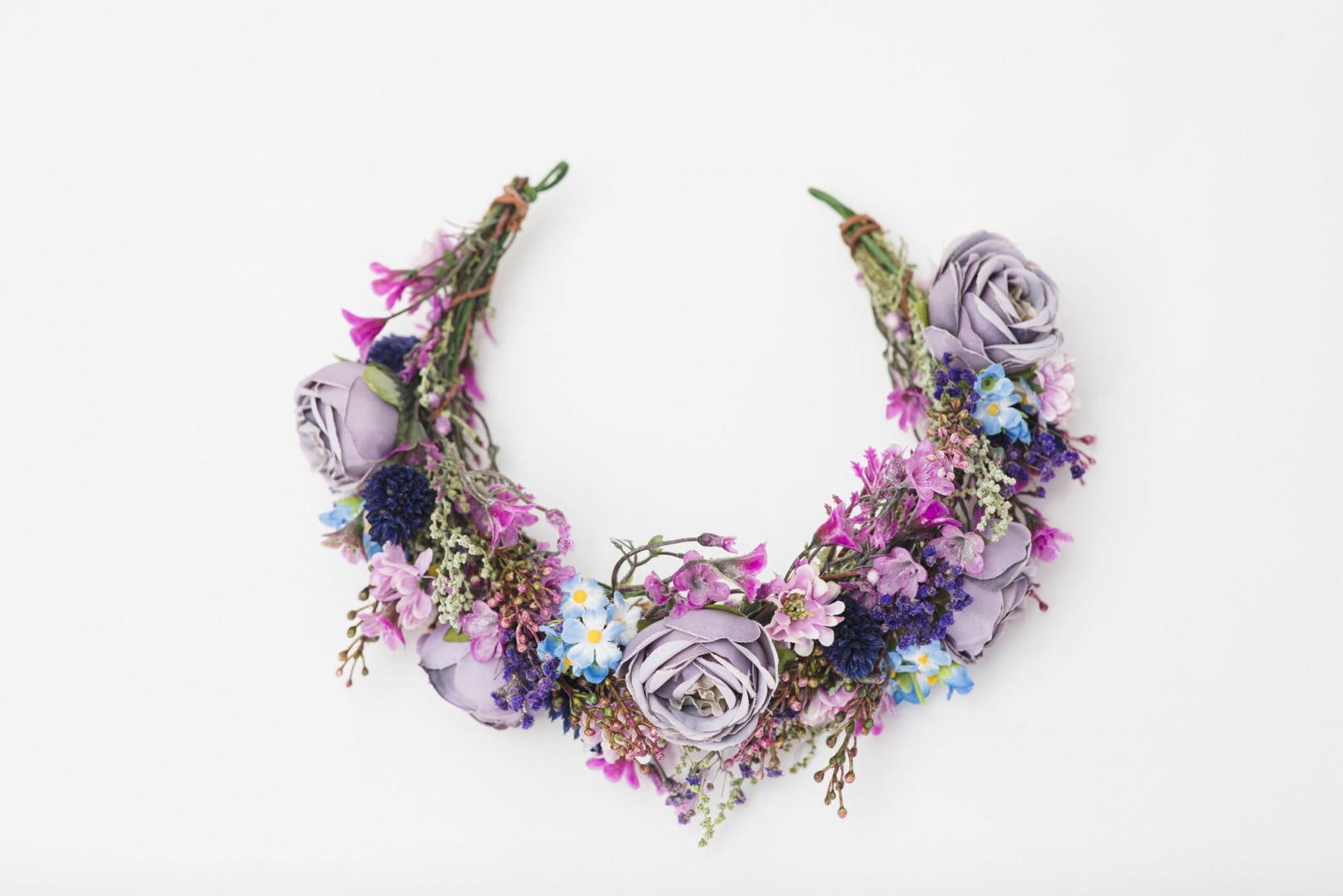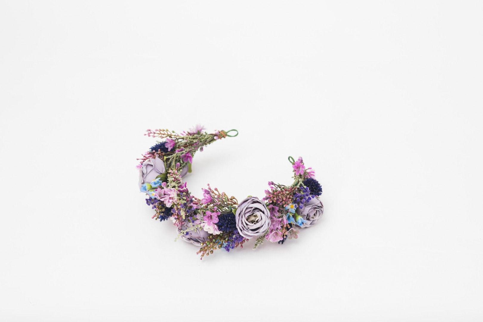 Purple flower half wreath. Customisable. Perfect for weddings or other celebrations. Can be worn in the front or at the back of your head.