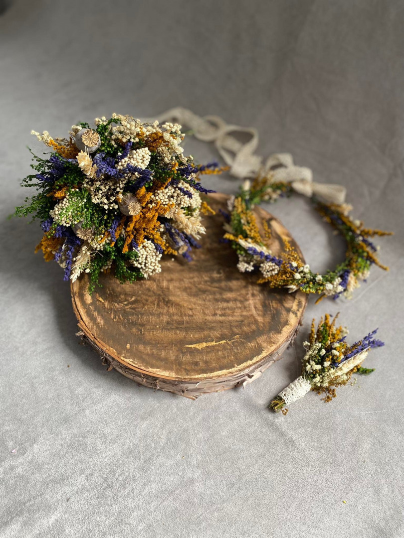 Svadobná boho kytica zo sušených a konzervovaných materiálov. Životnosť kytice je pri správnom skladovaní a starostlivosti 10-15 rokov (viac sa dozviete v sekcii STAROSTLIVOSŤ). Kyticu nikdy nedávajte do vody