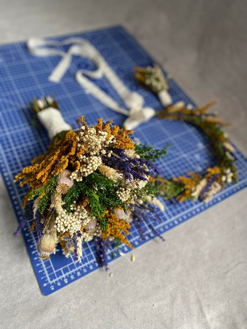 Kytica je vyrobená z konzervovaných tráv, gypsomilky, levandule, kláskov a iných drobností určených k aranžovaniu.