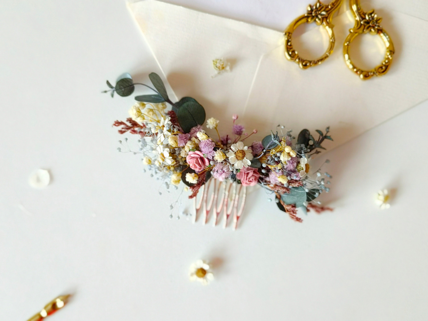 Set consists of hair comb in two sizes, hairpins and boutonnieres...