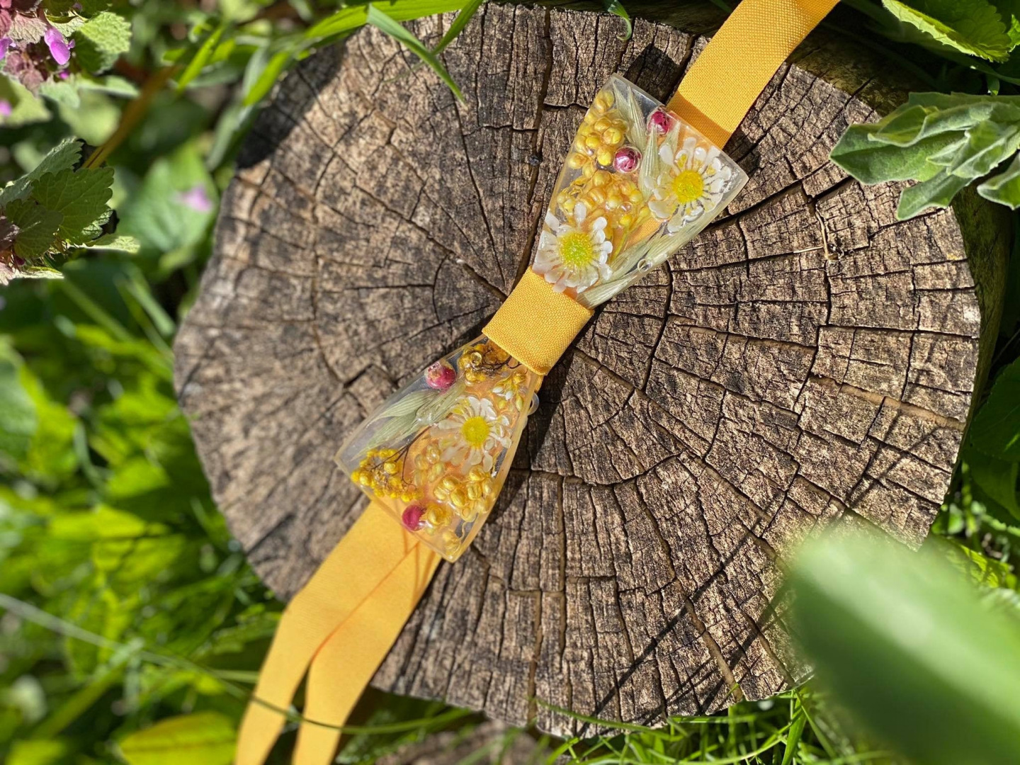 Ručne robený pánsky svadobný motýlik s kvetmi (môže sa kombinovať aj s drevom) z našej dielničky zaliaty v živici. Jedinečný handmade produkt a originálny svadobný doplnok pre ženícha. Môže poslúžiť aj ako plesový motýlik k pánskemu obleku.
