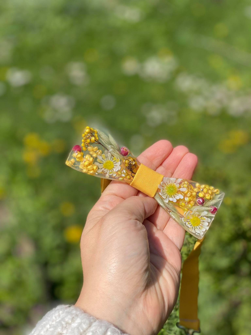 Ručne robený živicový motýlik s kvetmi z našej dielničky. Môže sa kombinovať aj s drevom. Viazanie je kvalitne šité a nastaviteľné, farba viazania sa dá prispôsobiť. V prípade, ak motýlik nie je skladom, doba výroba je 2-3 týždne.