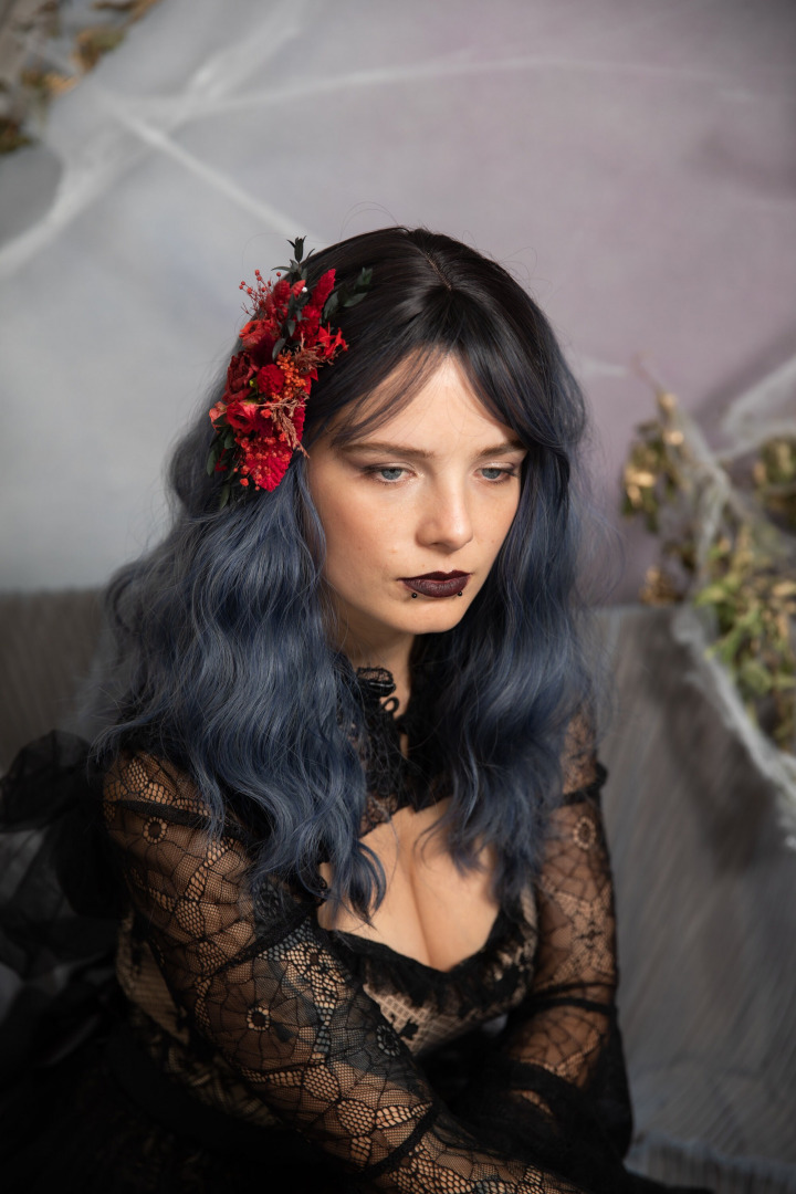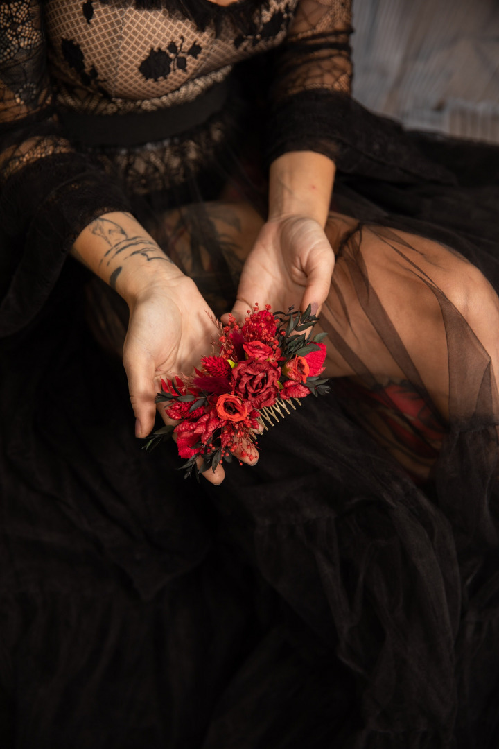 The flower comb is made of artificial flowers, leaves, grass, wire, floristic tape and other trinkets used for arranging.
