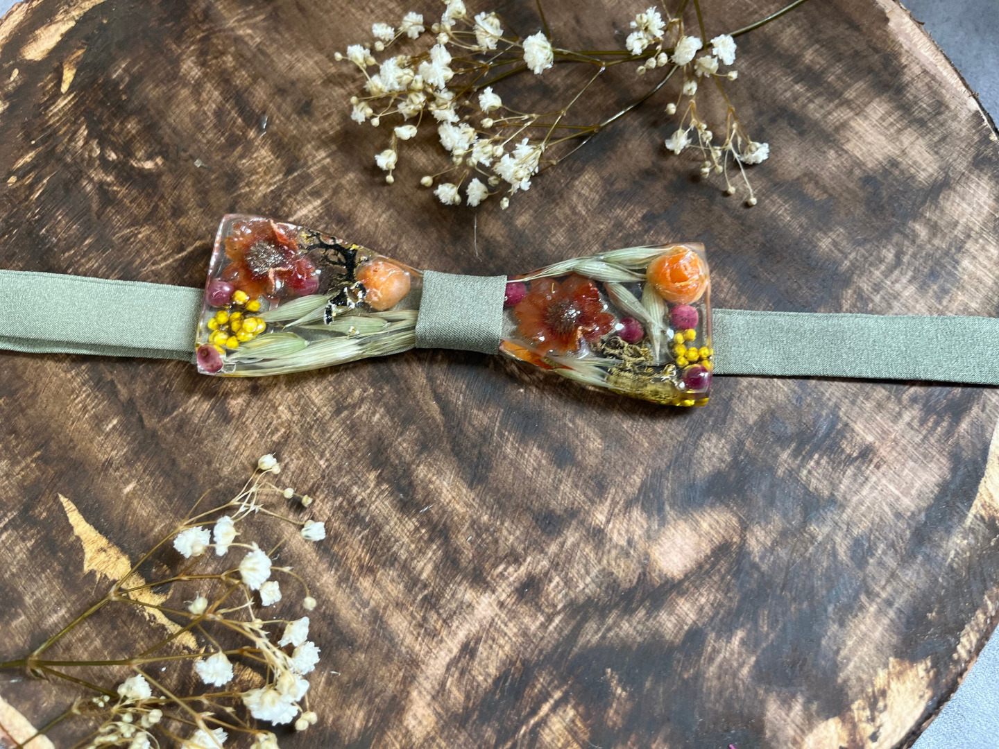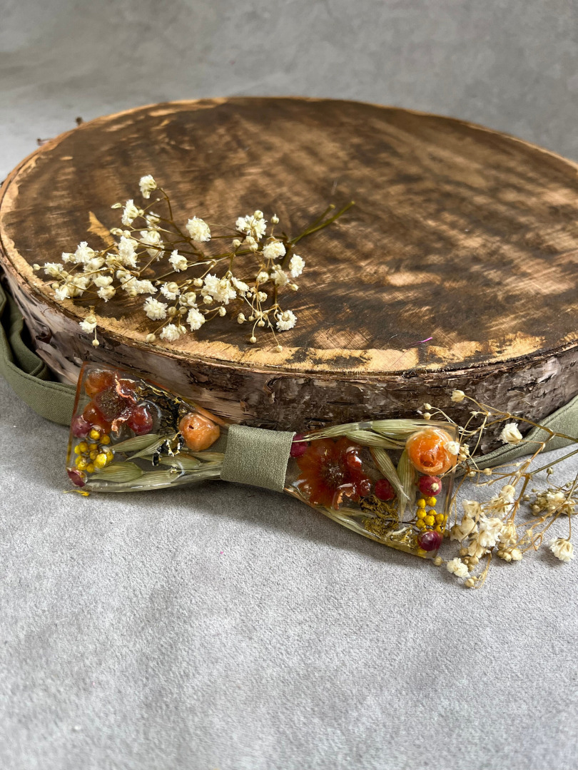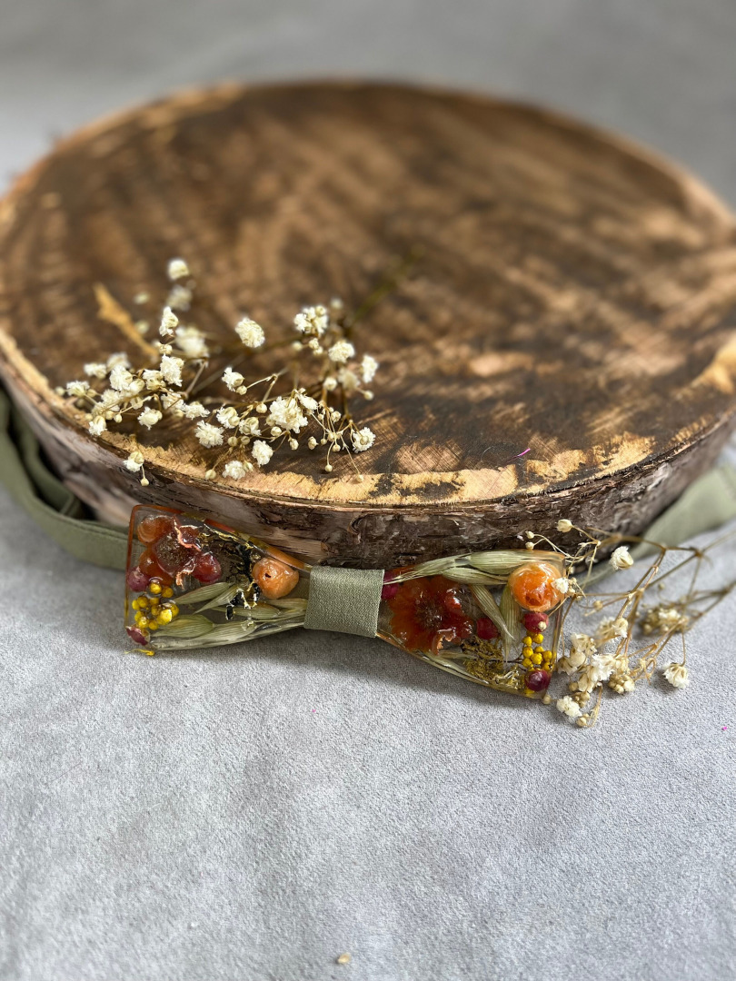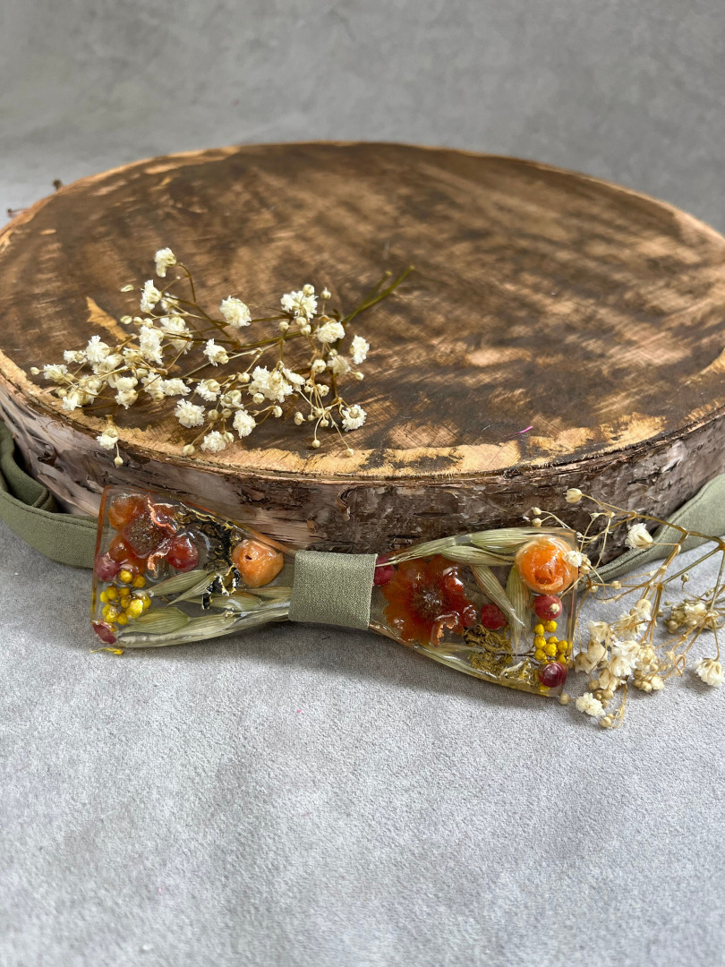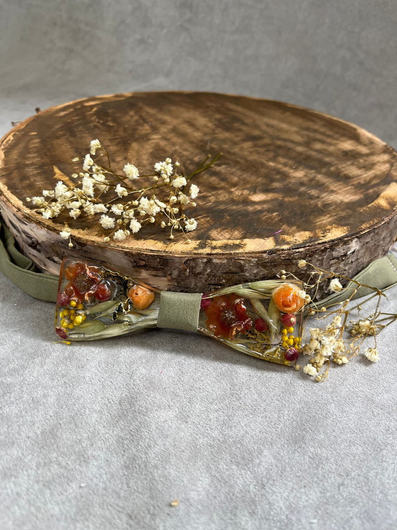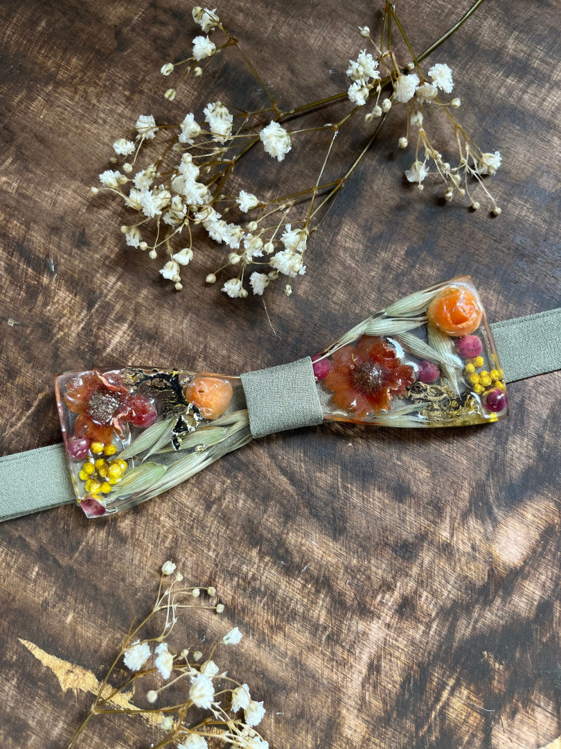Ručne robený pánsky svadobný motýlik s kvetmi (môže sa kombinovať aj s drevom) z našej dielničky zaliaty v živici. Jedinečný handmade produkt a originálny svadobný doplnok pre ženícha. Môže poslúžiť aj ako plesový motýlik k pánskemu obleku.