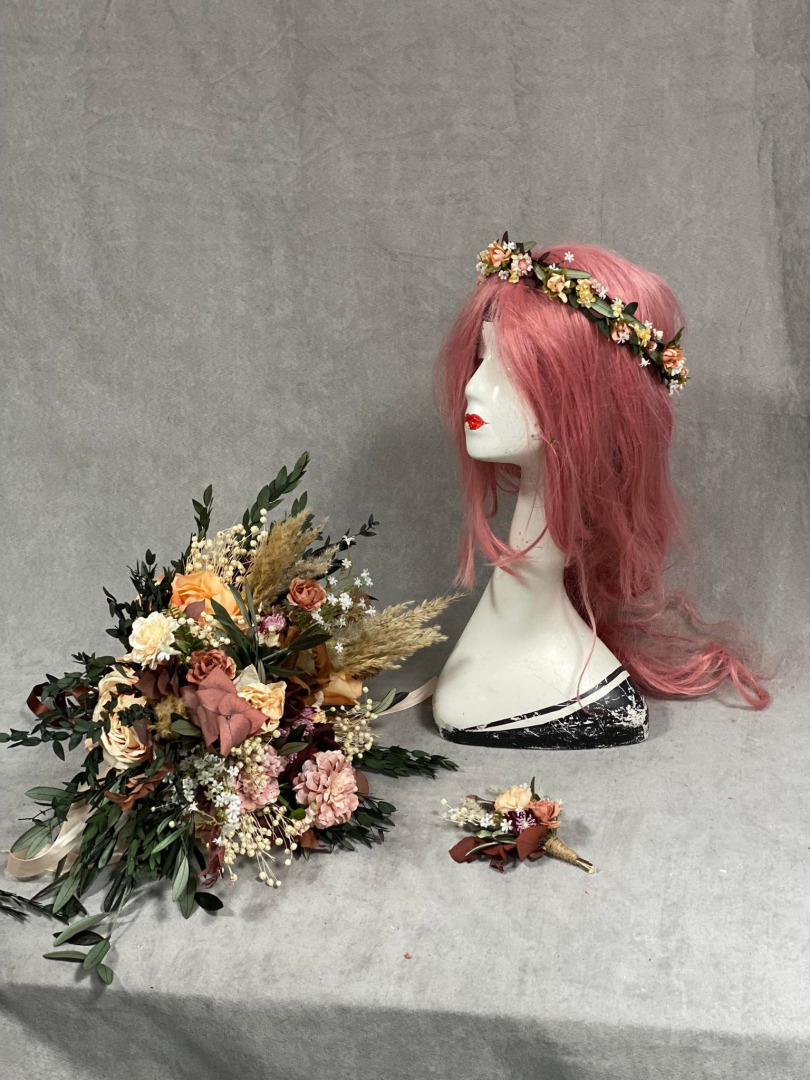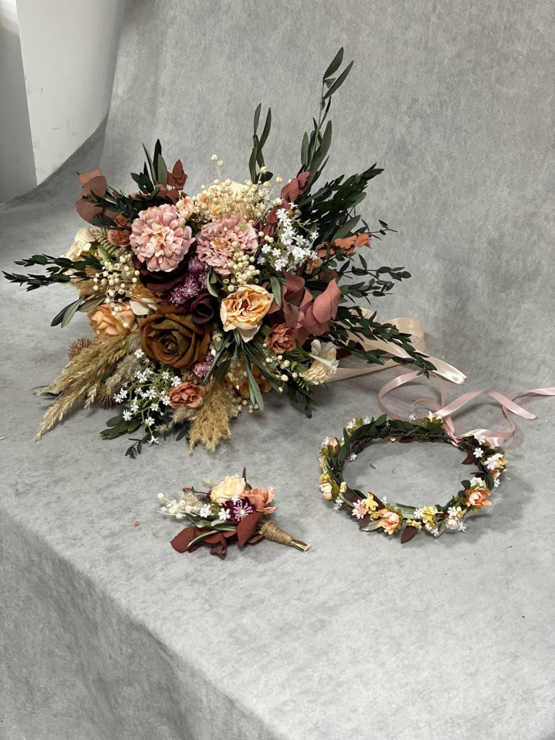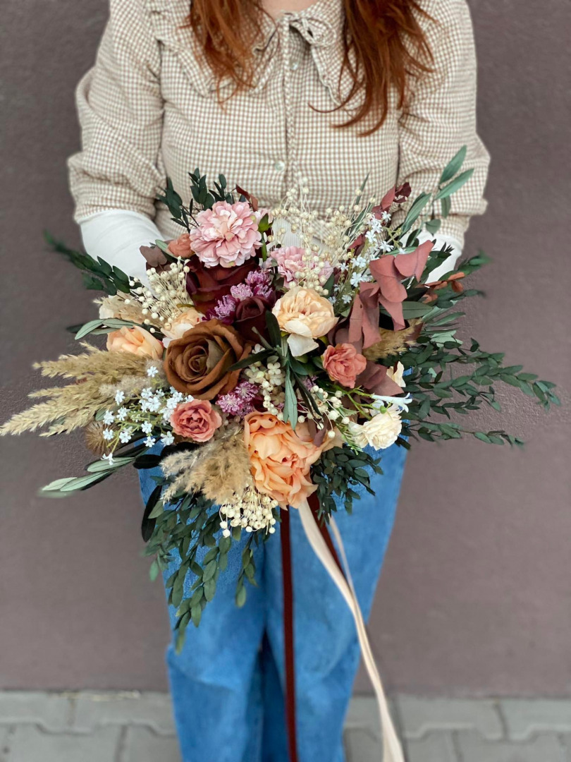 Svadobná boho kytica z umelých a konzervovaných materiálov. Životnosť kytice je pri správnom skladovaní a starostlivosti 10-15 rokov (viac sa dozviete v sekcii STAROSTLIVOSŤ). Kyticu nikdy nedávajte do vody