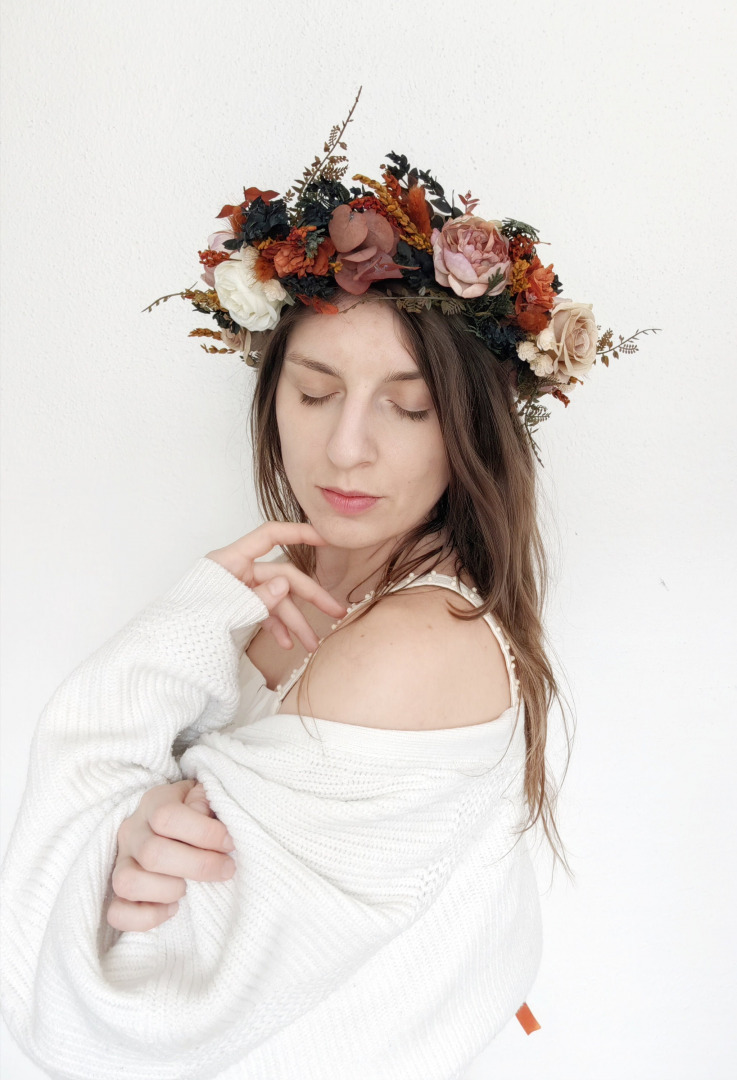Boho flower bridal hair wreath. Adjustable size. In terracotta tones.