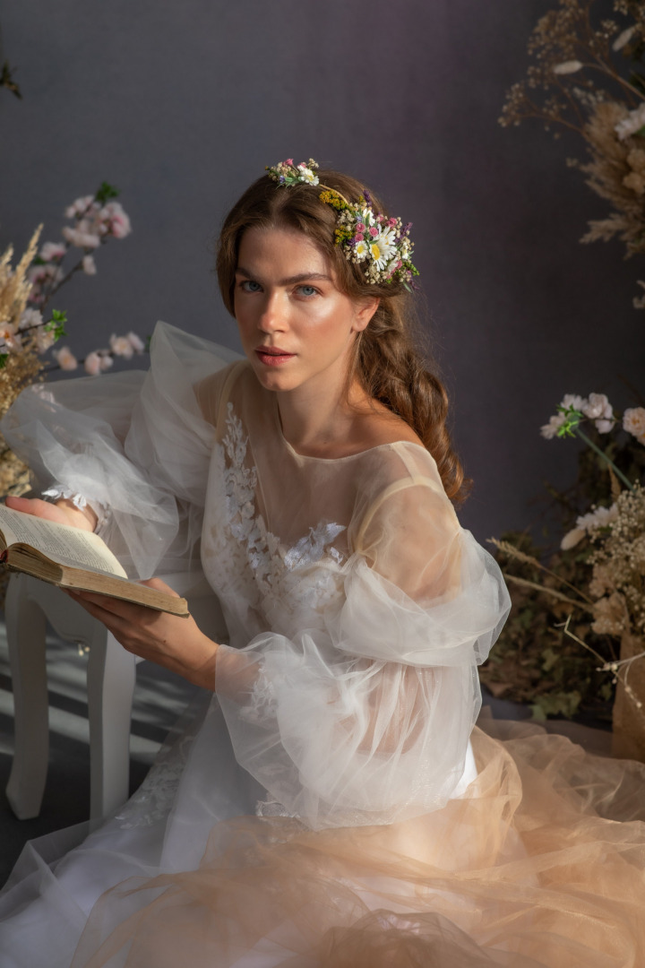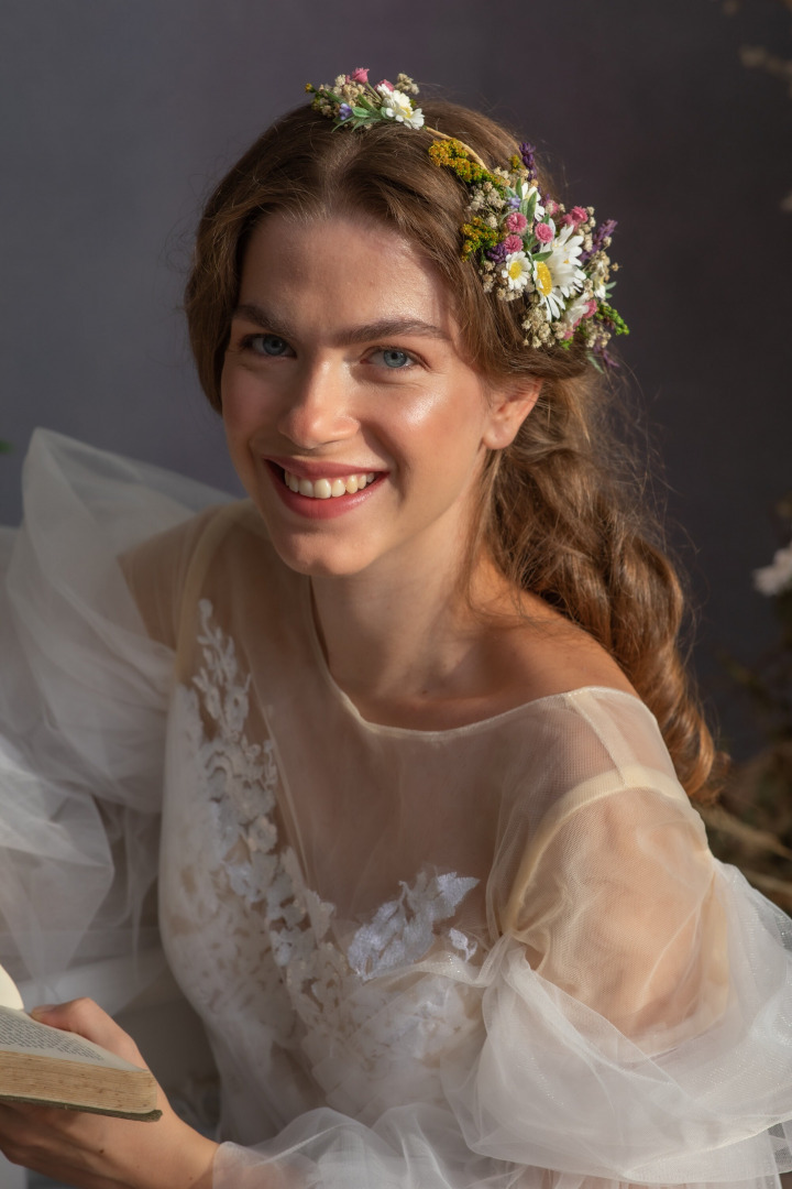 The flower hair vine s made of preserved and artificial flowers, grass, leaves, floristic tape, wire...