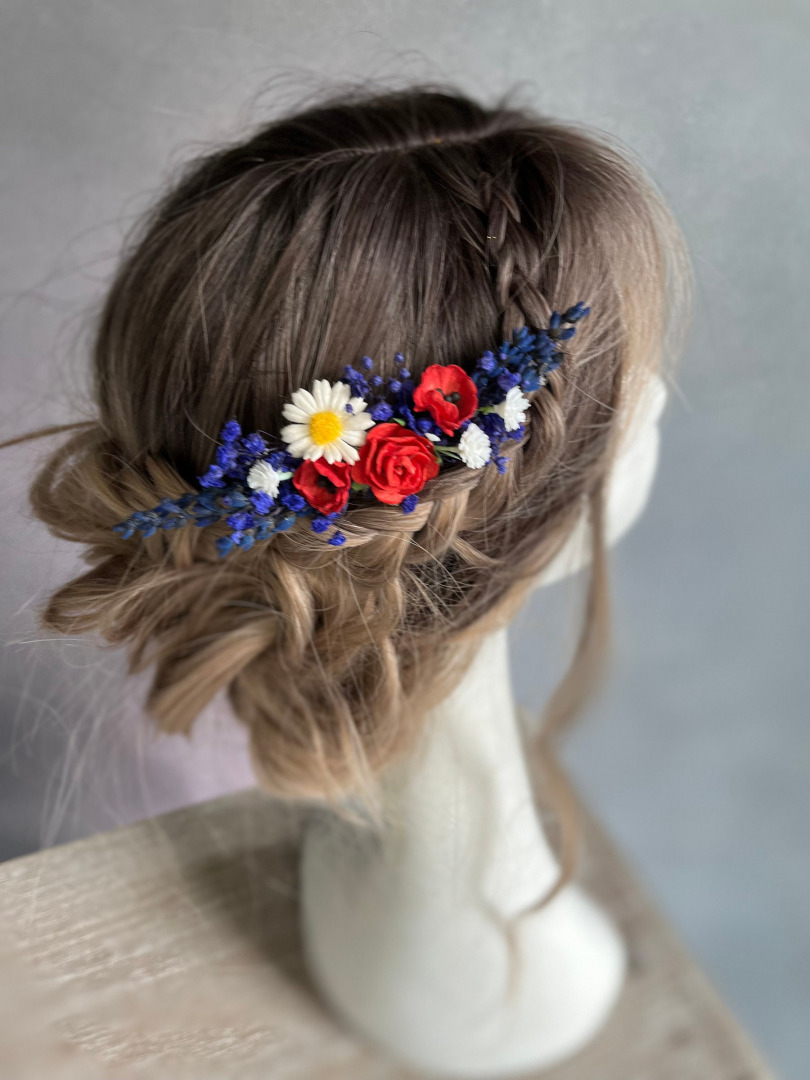 The flower comb is made of artificial/fabric flowers, preserved flowers, leaves, grass and other trinkets used for arranging.
