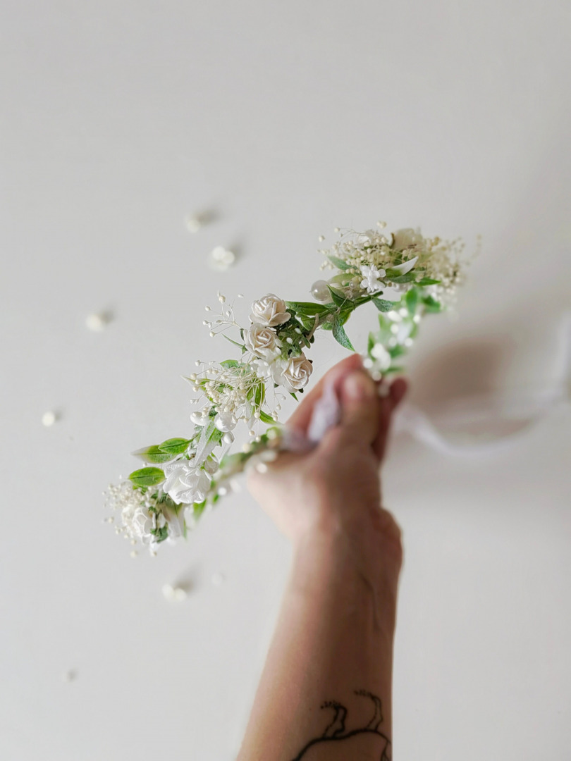 This hair wreath is made of artificial flowers and preserved material. Elegant headpiece handcrafted with love. We also offer other headbands, floral belts, bracelets, head wreaths or candle decoration for first holy communion.