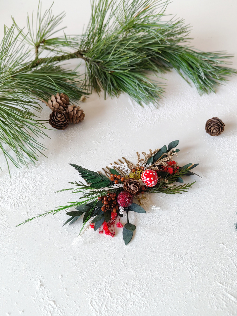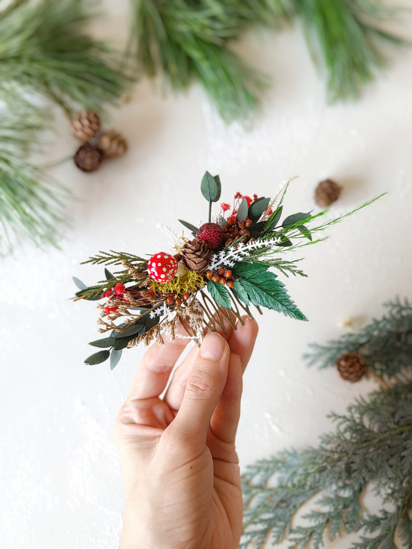 Christmas/winter flower hair comb with toadstool and pine cones in woodland design :)