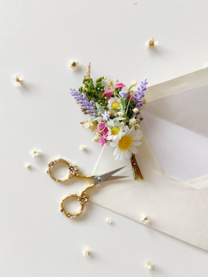Pierko je vyrobené z textilných kvetov, lístkov, trávy, drôtiku, floristickej pásky a iných drobností určených k aranžovaniu.