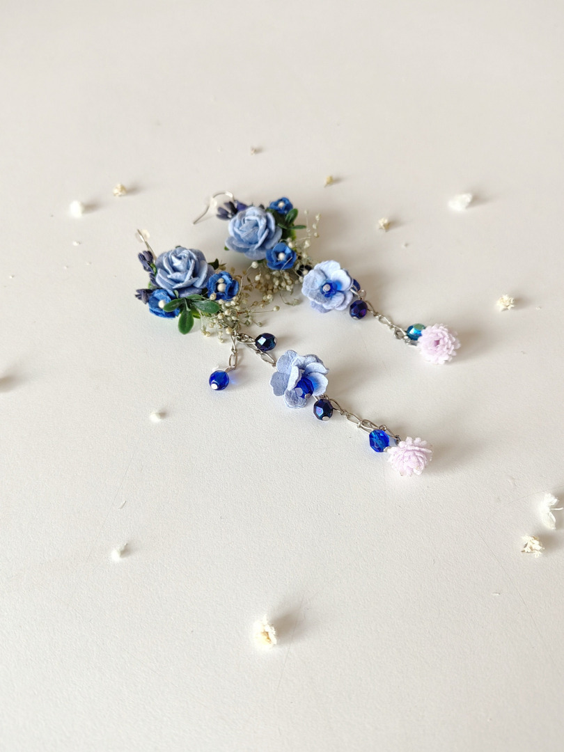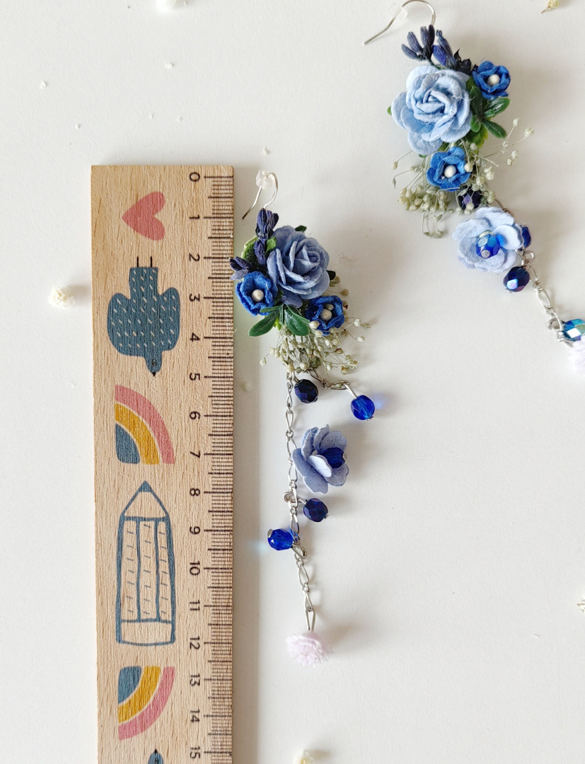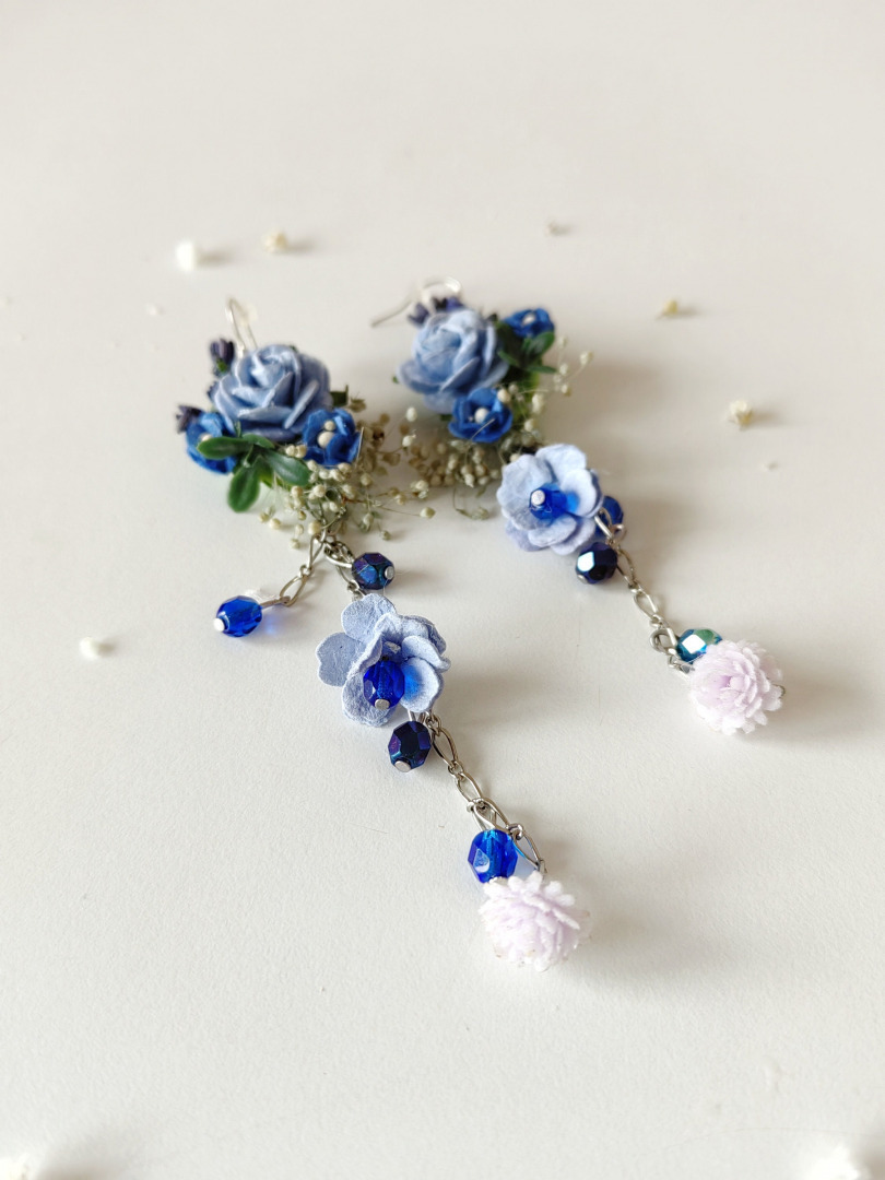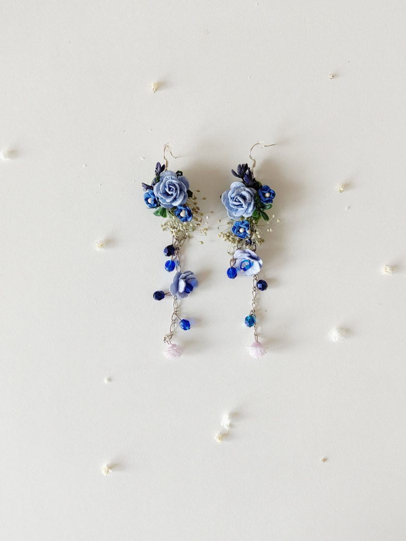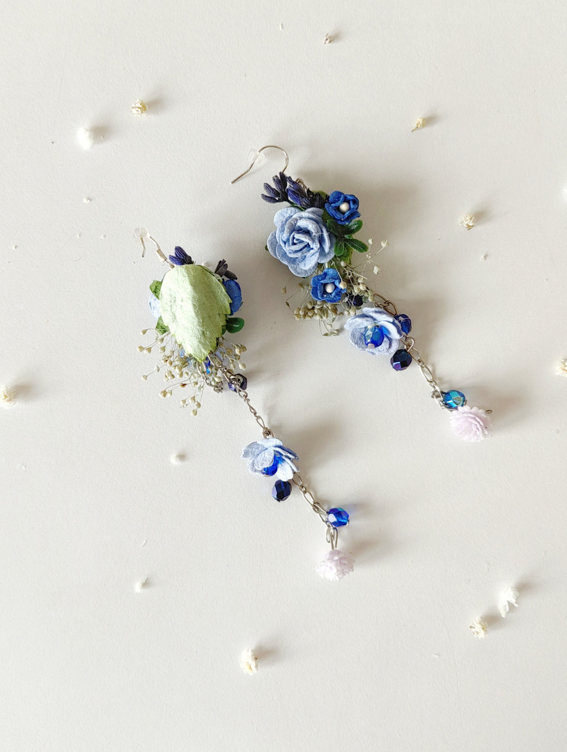 The earrings are made of artificial flowers, leaves and grass, chains, beads, and other trinkets used for arranging :)