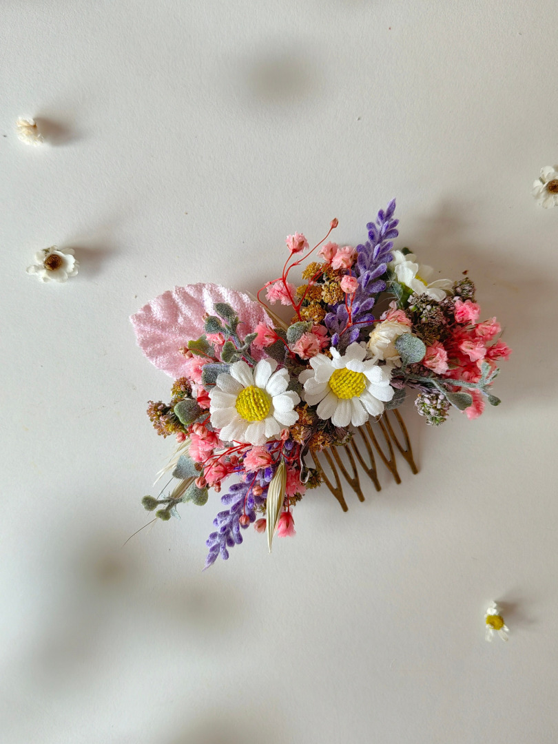 Small bridal hair comb made from artificial and preserved material. Beautiful meadow design.