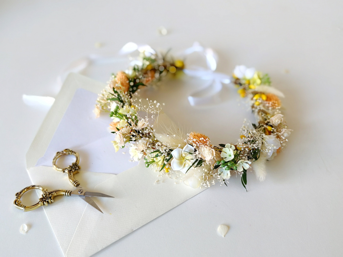Plumeria boho flower wreath in orange, yellow, white and cream tones
