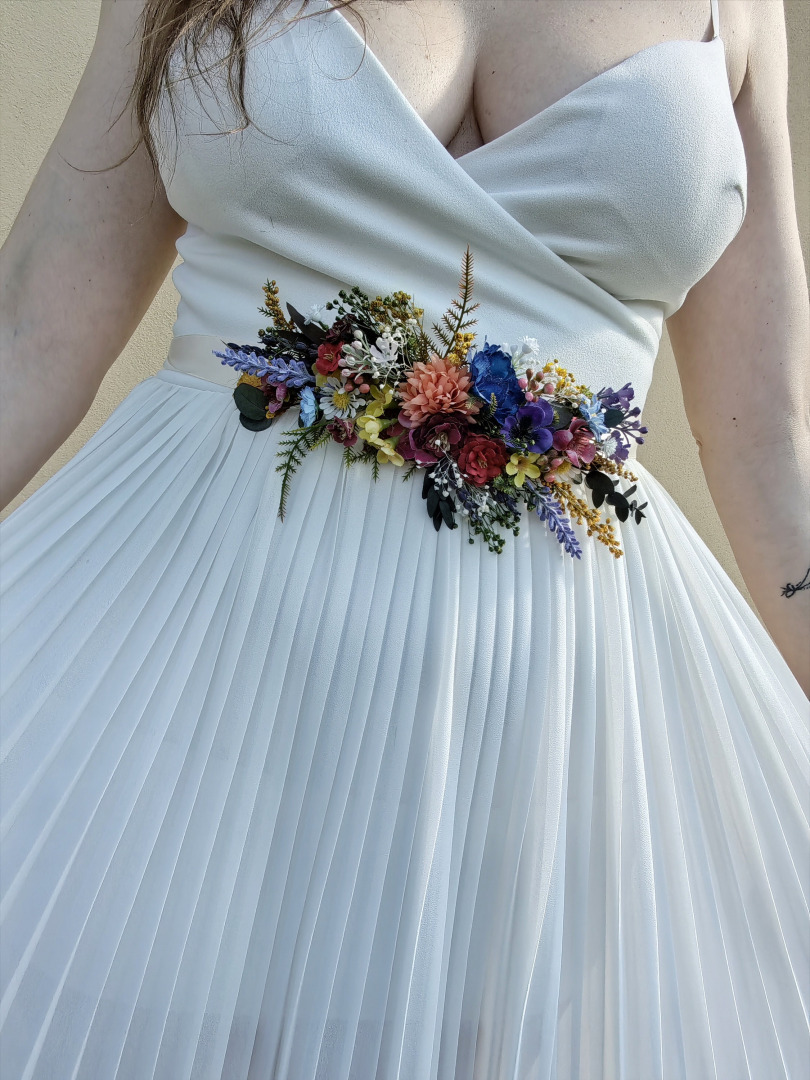 The flower belt is made of artificial/fabric flowers, preserved materials, ribbon and other trinkets used for arranging.