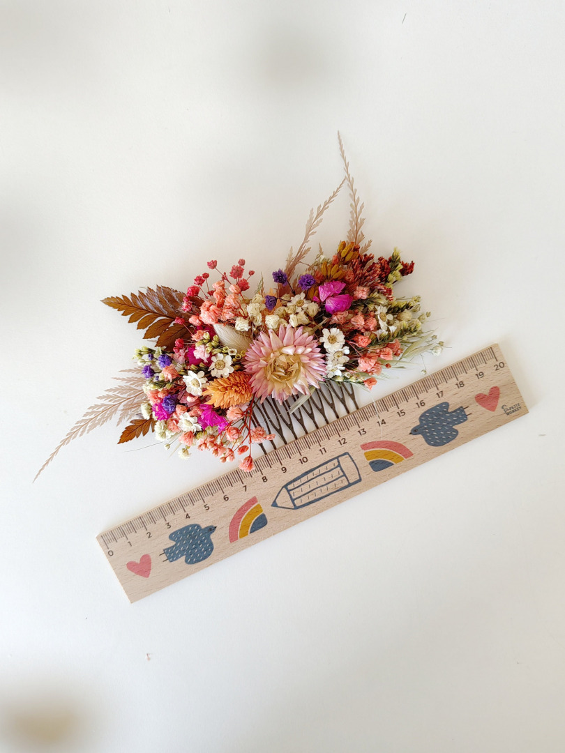 The flower hair comb is made of preserved and dried material. It's fragile natural material so some material may fall off, especially during transport. It shouldn't change the overall look/design of the hair comb.