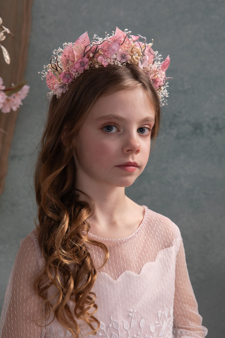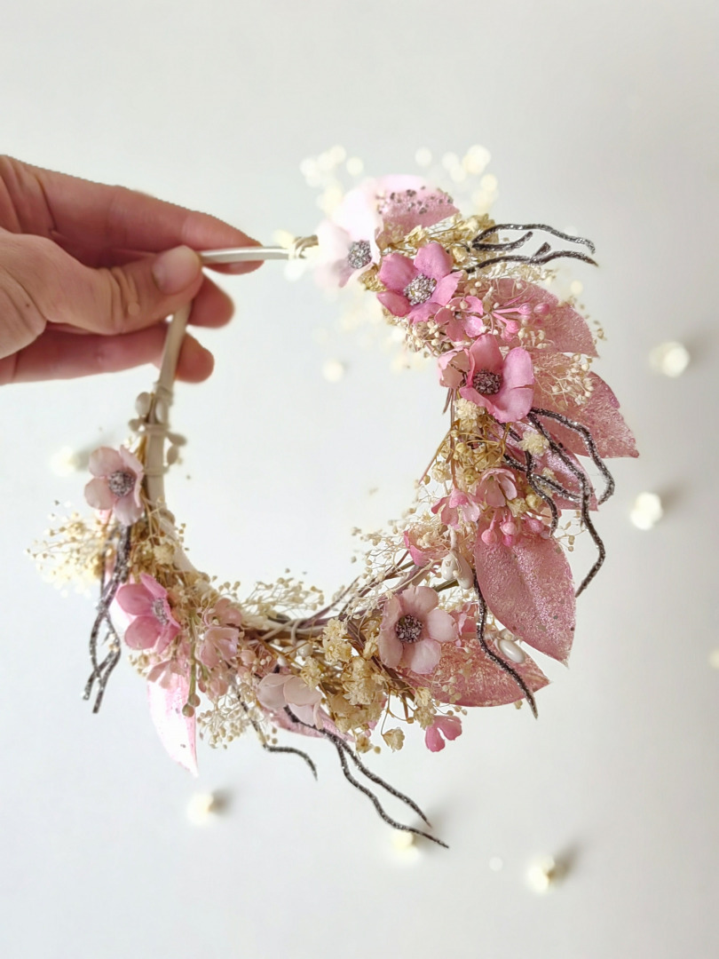 Klasická kvetinová čelenka na špeciálne príležitosti aj bežný deň,zdobená po celom obvode. Mäkký ohybný základ,netlačí ani pri okuliaroch. Univerzálna,vhodná už pre deti od dvoch rokov.