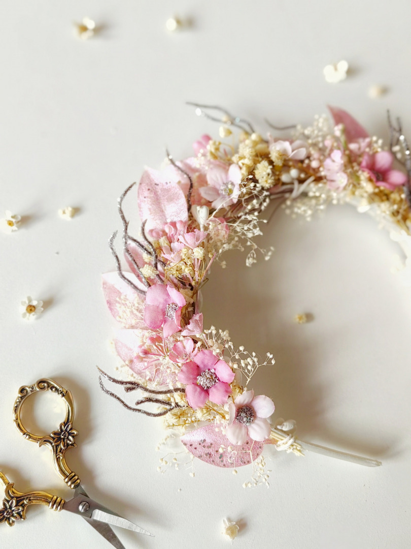 Korunka je vyrobená z kvietkov, lístkov a iných drobností určených k aranžovaniu.