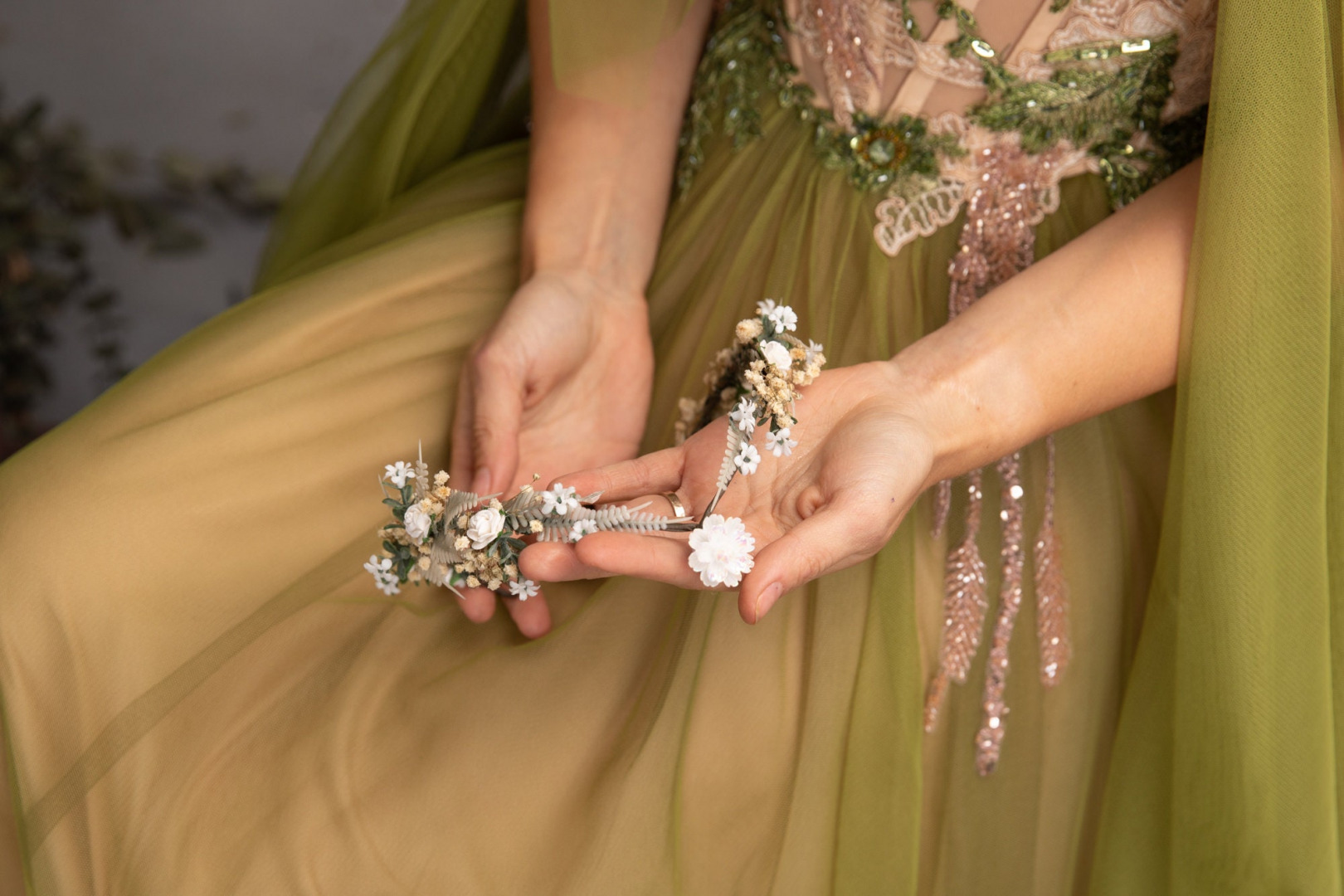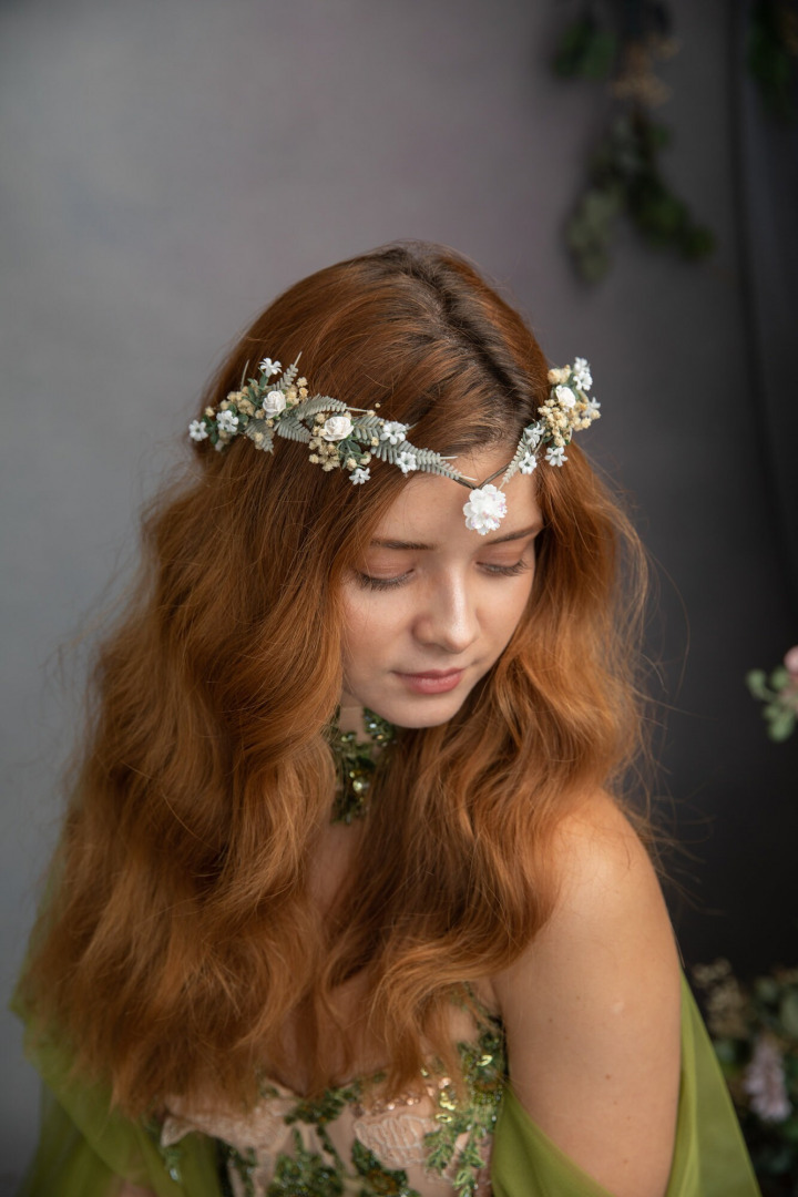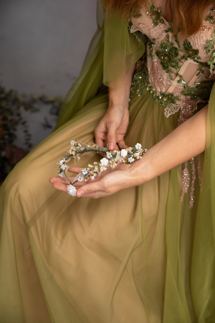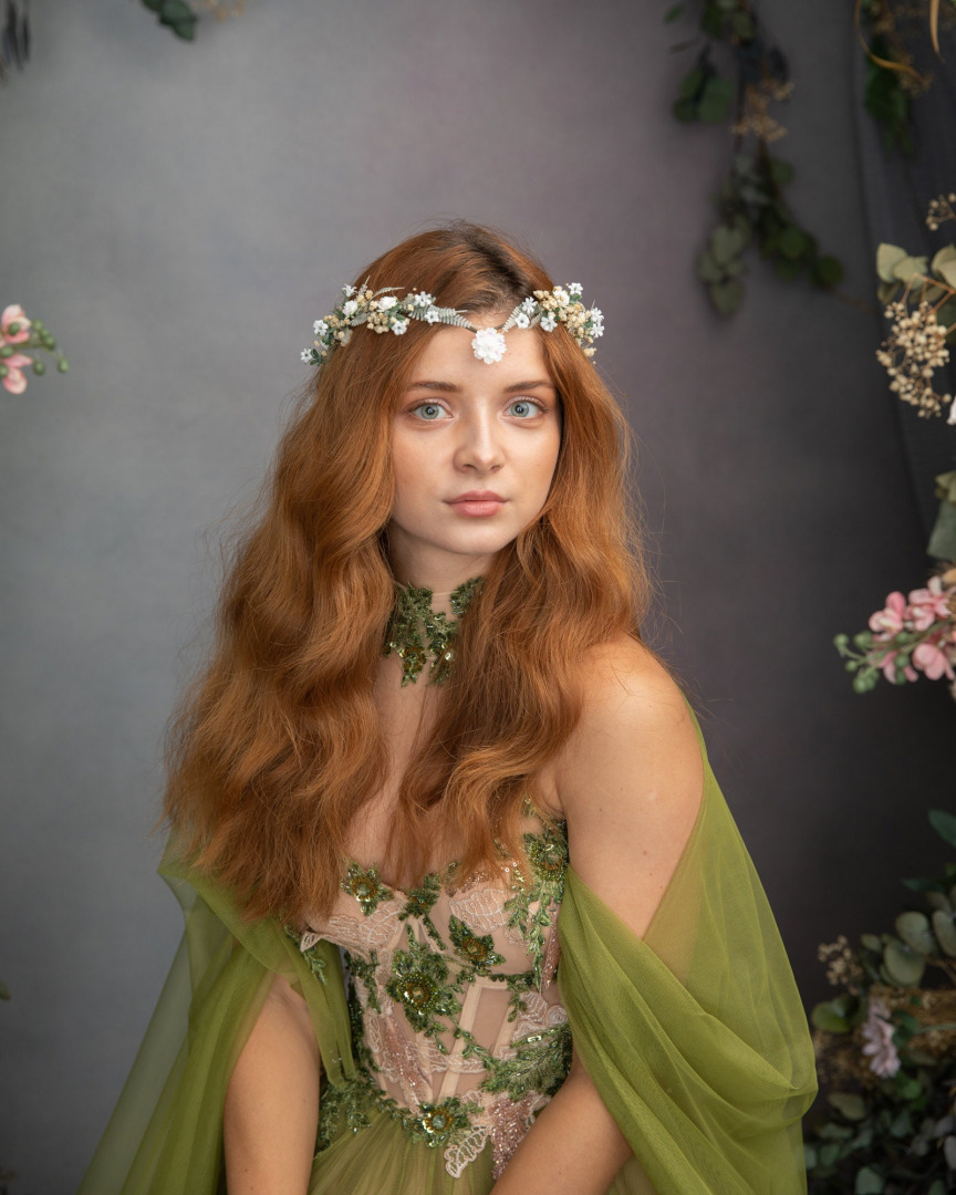 Romantic wedding tiara :) Perfect for renaissance festivals, parties, weddings, photoshoots, Halloween, carnivals, . . . The tiara is made of artificial material, preserved material and other arranging material. Dress: Chotronette ...