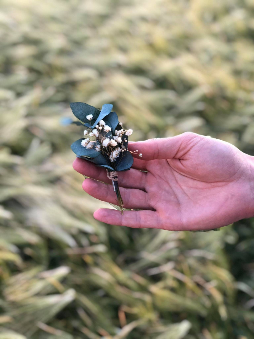 Pierko je vyrobené z konzervovaných lístkov eukalyptu, gypsomilky, drôtiku, floristickej pásky a iných drobností určených k aranžovaniu.
