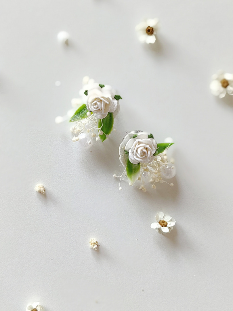 The earrings are made of artificial flowers, preserved materials and other trinkets used for arranging :)