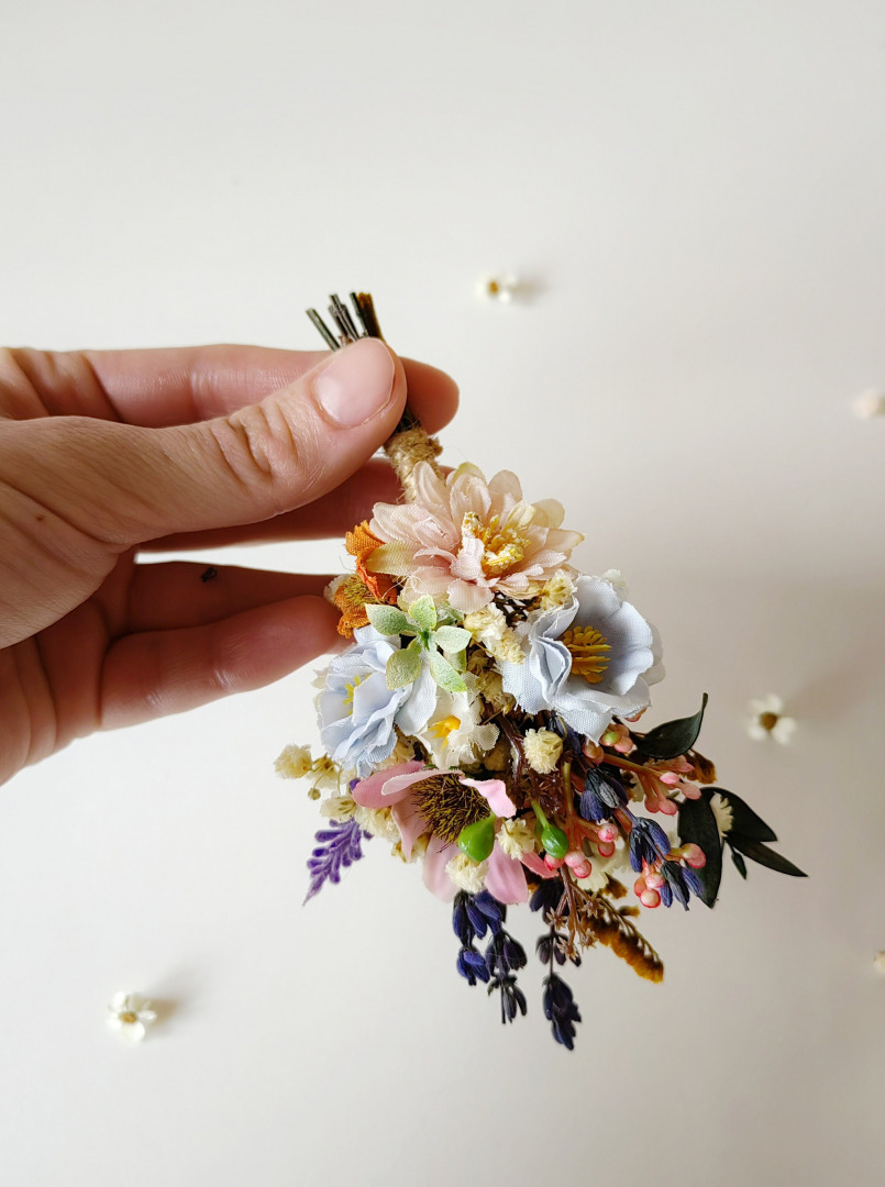 Pierko je vyrobené z textilných kvetov, lístkov, trávy, drôtiku, floristickej pásky a iných drobností určených k aranžovaniu...