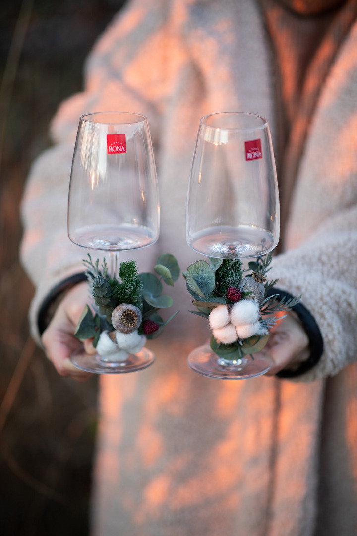 Kvetinový aranžmán na svadobné poháre,ale aj iné špeciálne príležitosti,vďaka ktorým bude z vášho stolovania umelecké dielo.Pripevňujú sa drôtikovým viazaním o stopku pohára.