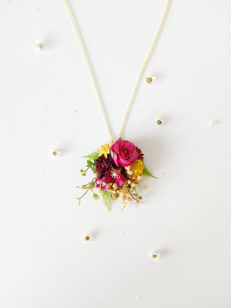 Pink yellow flower necklace Long flower necklace Bridal accessories Wedding jewellery Flower jewellery necklace pendant Magenta flowers