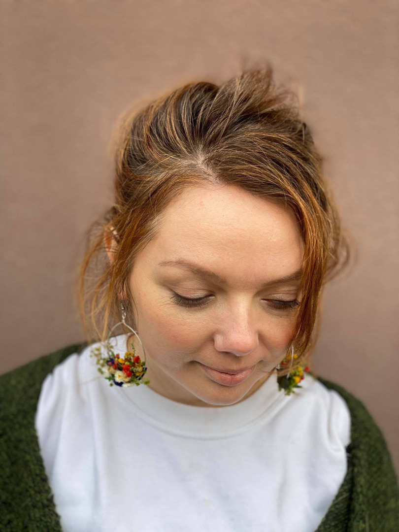 The earrings are made of preserved flowers, leaves and grass, wire, and other trinkets used for arranging :)
