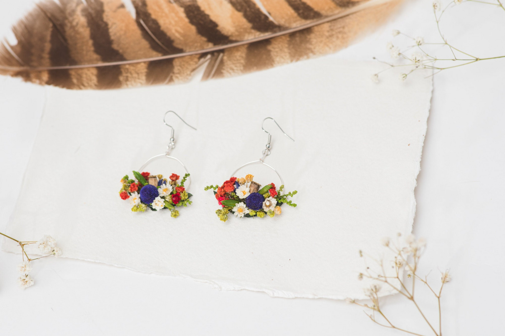 Folk circle dangle earrings Flower earrings Surgical steel Colourful flower earrings for bride Dried flowers Magaela Bridal handmade