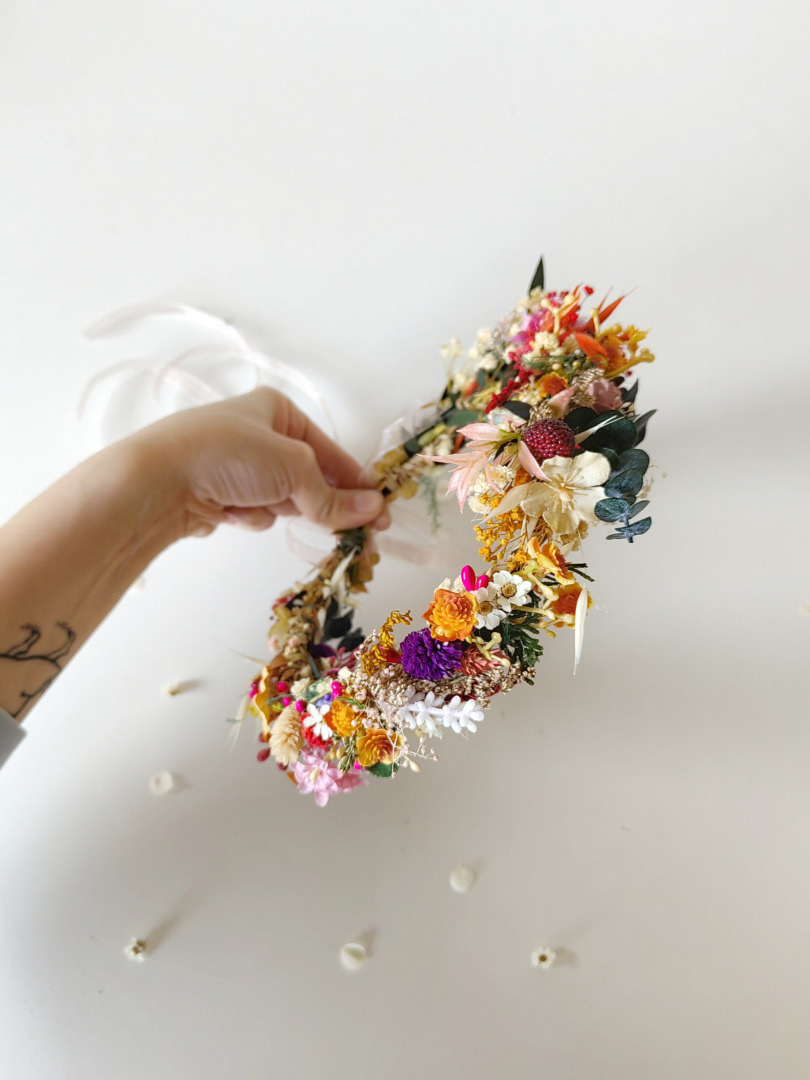 The flower hair crown is made of artificial/fabric flowers, preserved flowers, leaves, grass and other trinkets used for arranging.