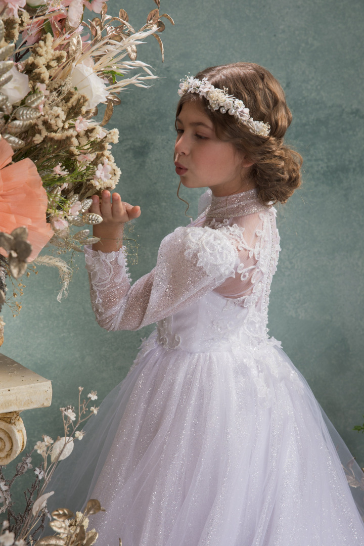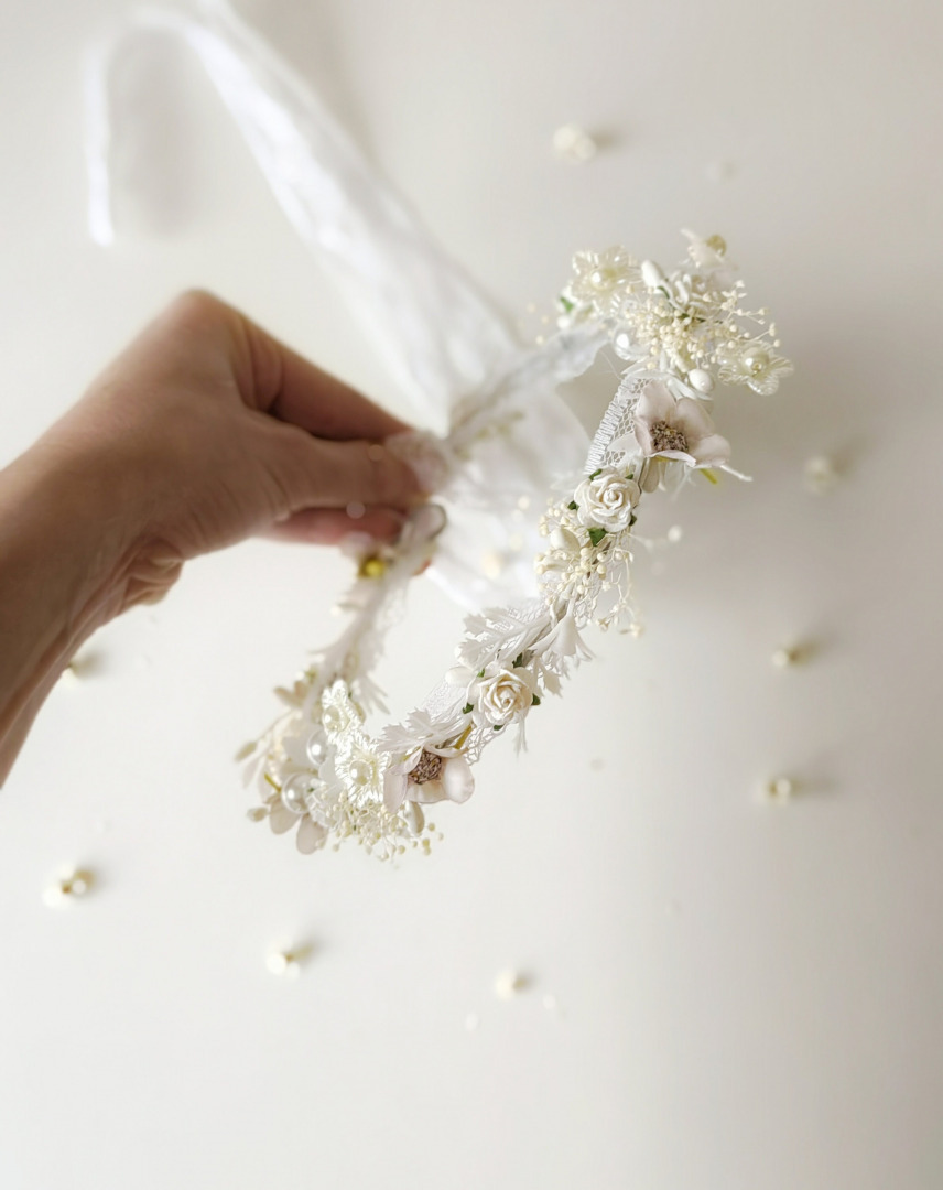 This hair wreath is made of artificial flowers, pearls and preserved material. Elegant headpiece handcrafted with love. We also offer other headbands, floral belts, bracelets, head wreaths or candle decoration for first holy communion.