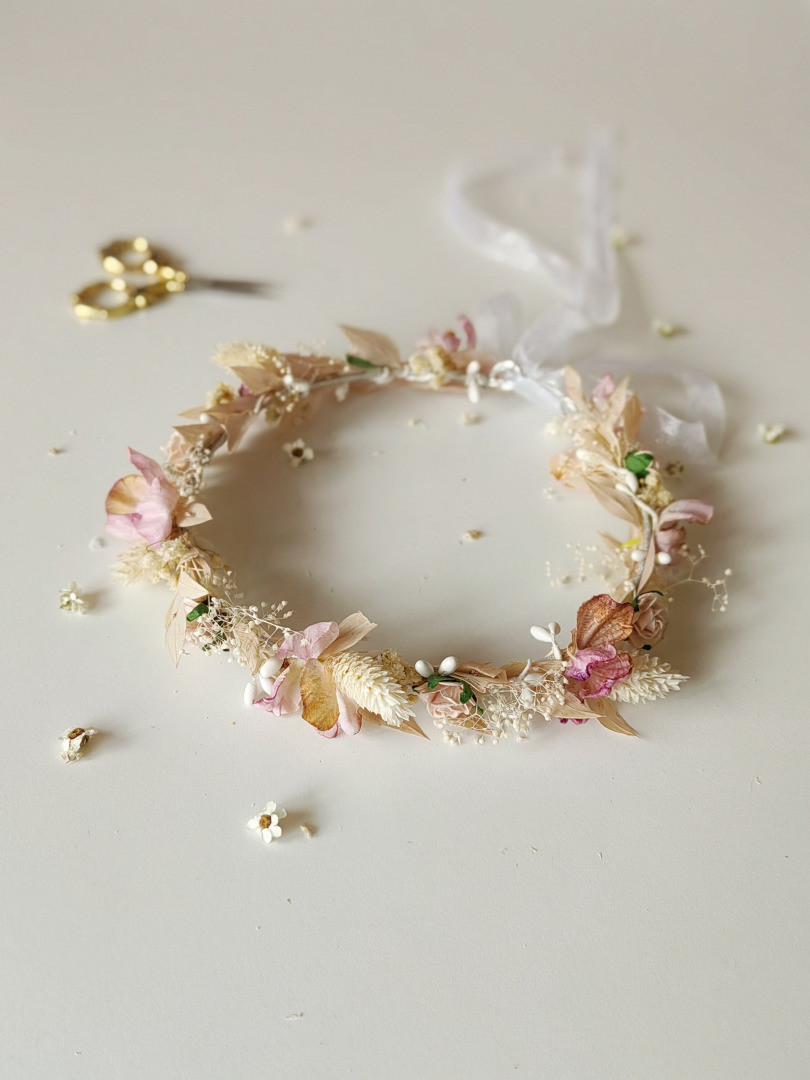 Romantic flower hair wreath in pink and cream tones, perfect for first holy communion, weddings or other special occasions and celebrations. Romantic fairycore design
