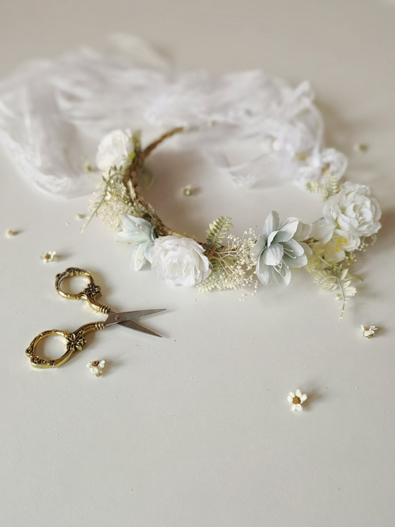 The flower wreath is made of artificial flowers, leaves, preserved grass, floristic tape and other trinkets used for arranging. Elegant headpiece handcrafted with love. We also offer other headbands, floral belts, bracelets, head wreaths or candle decoration for first holy communion.
