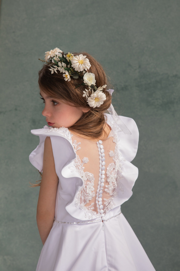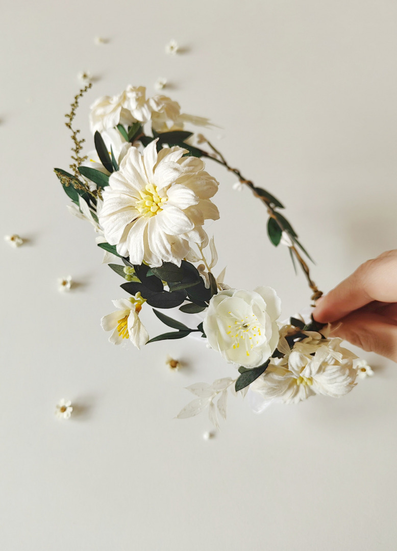 This hair wreath is made of artificial flowers and preserved material. Elegant headpiece handcrafted with love. We also offer other headbands, floral belts, bracelets, head wreaths or candle decoration for first holy communion.