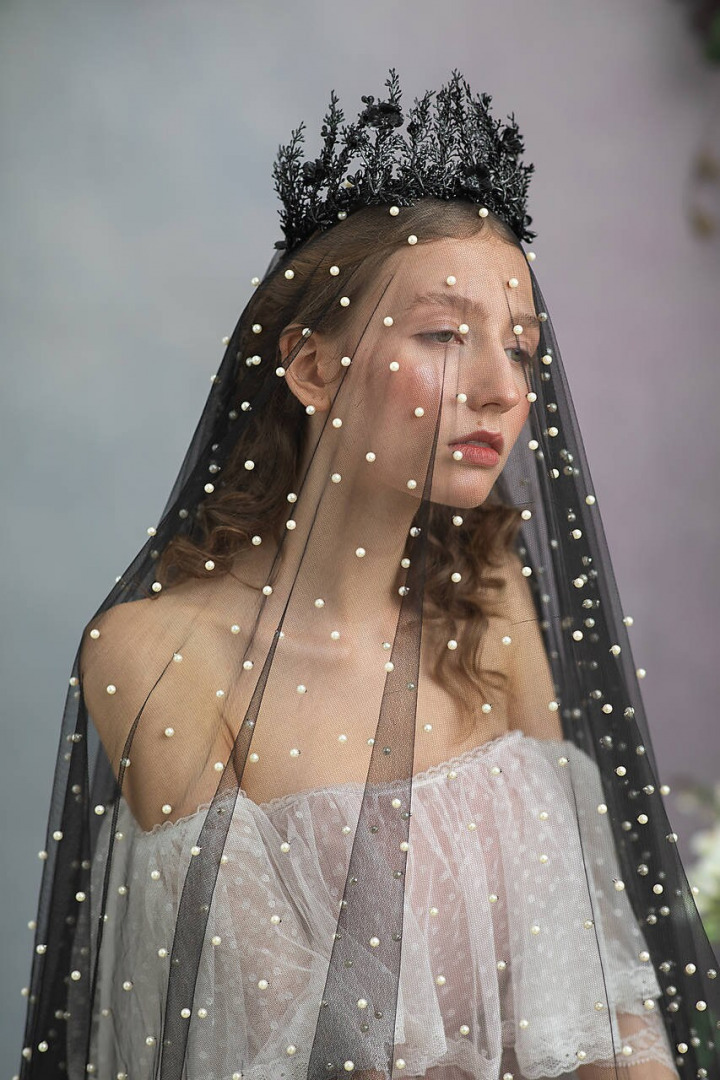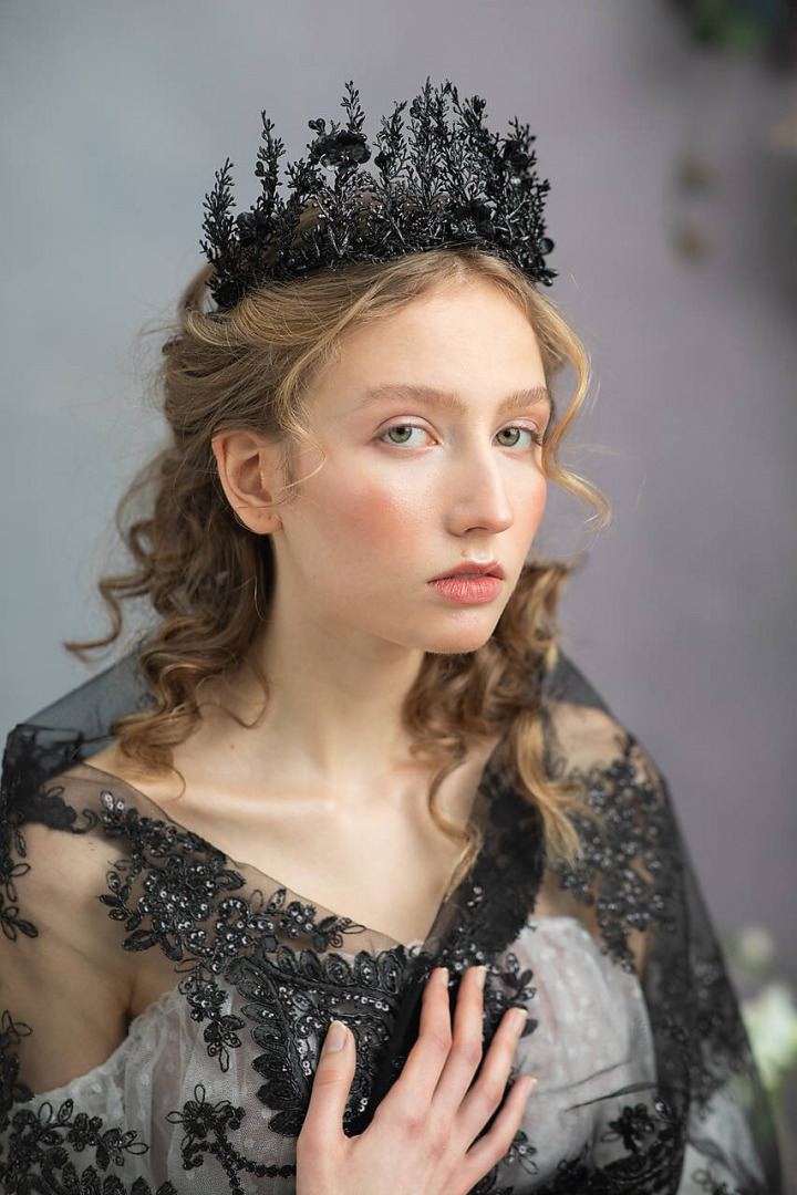 The flower crown is made of artificial flowers, leaves, grass, wire, floristic tape and other trinkets used for arranging.