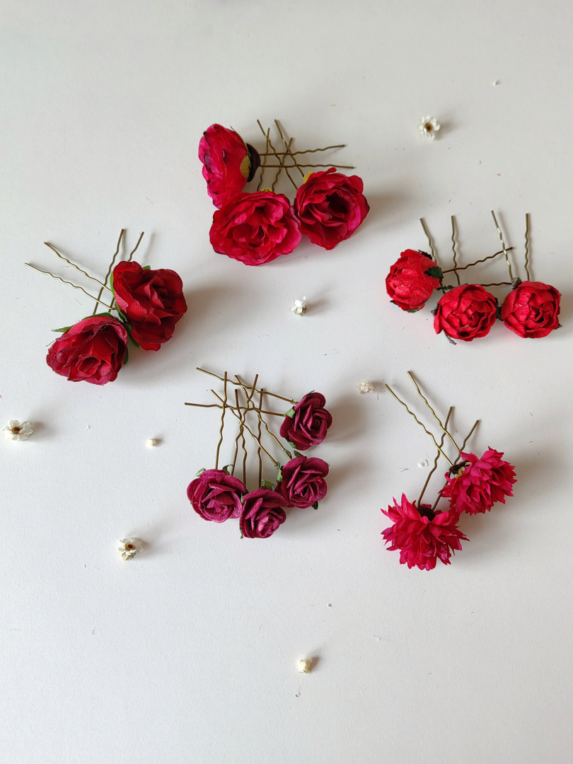 Red and burgundy flower hairpins - set of 14 hairpins, 5 types of flowers.