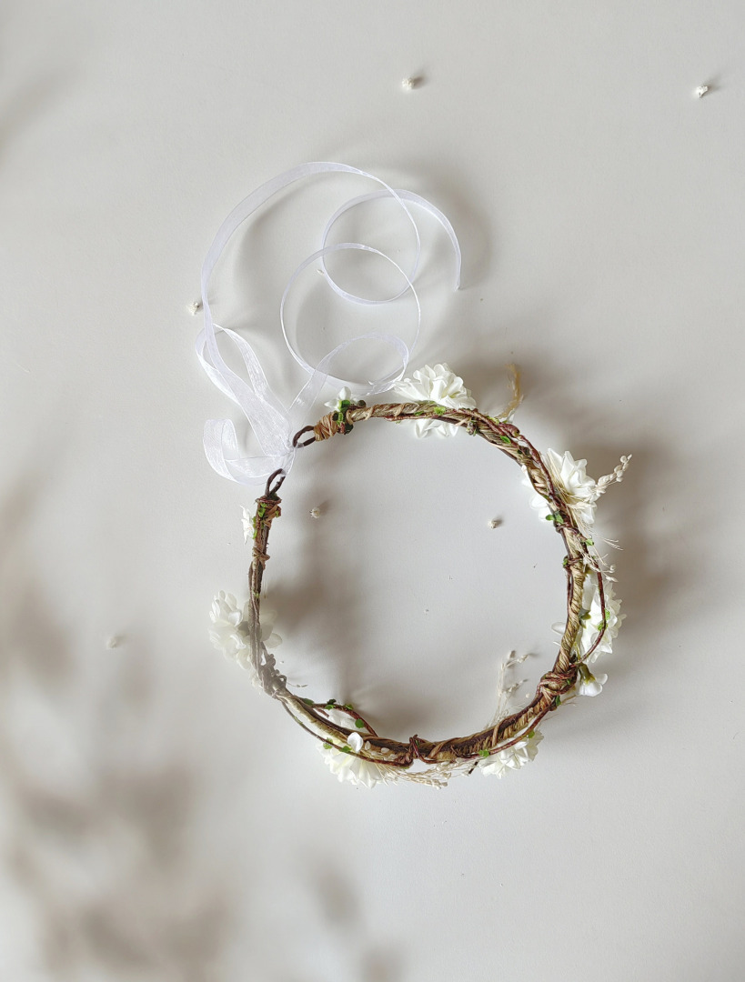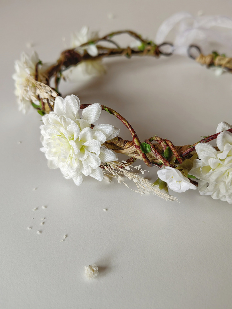 The flower hair wreath is made of artificial/fabric flowers, preserved flowers, leaves, grass and other trinkets used for arranging.