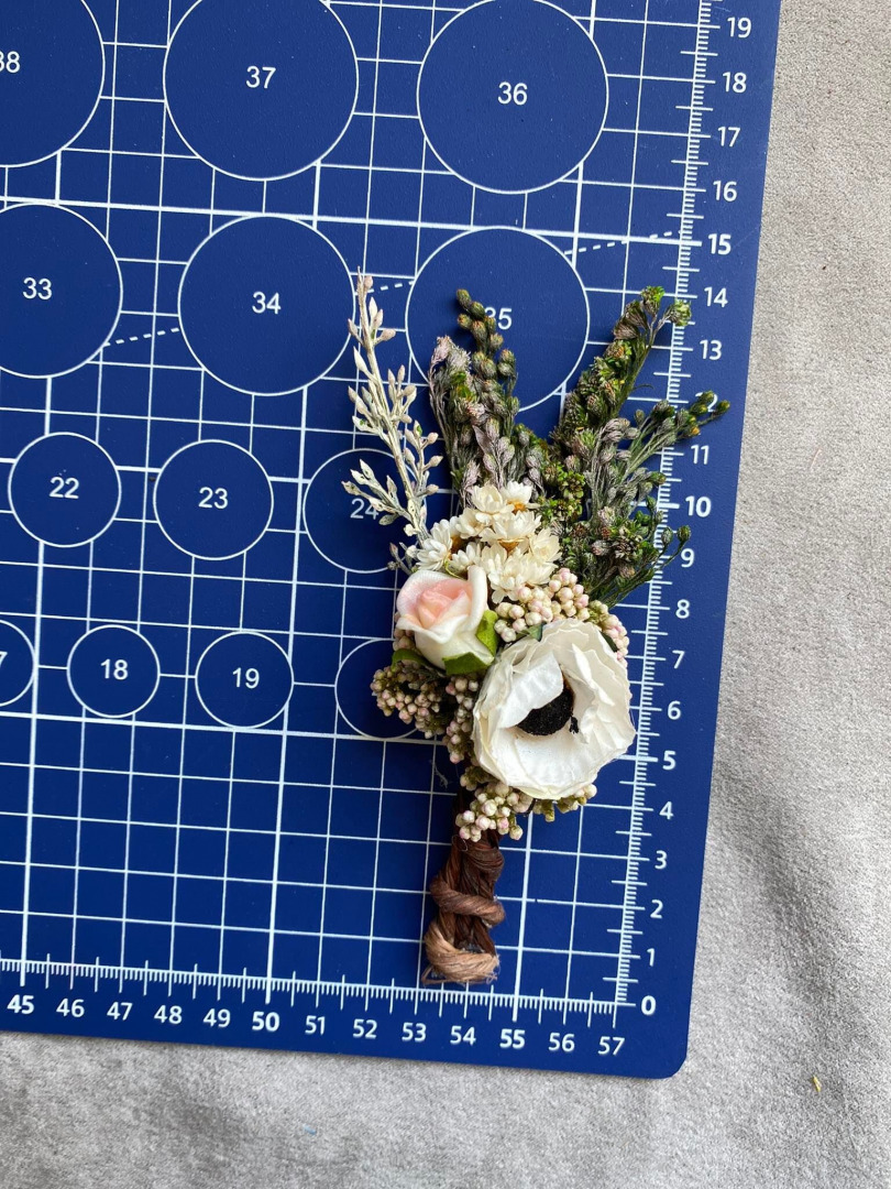 Pierko je vyrobené z textilných kvetov, lístkov, trávy, drôtiku, floristickej pásky a iných drobností určených k aranžovaniu.