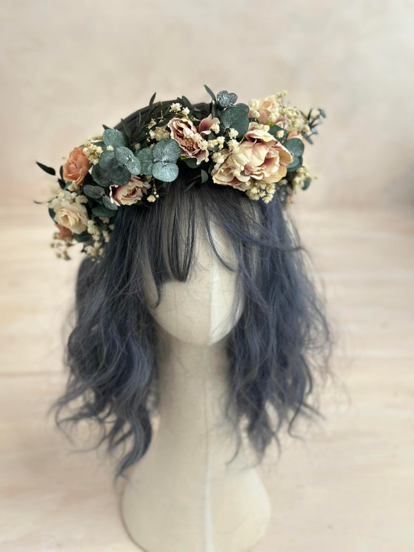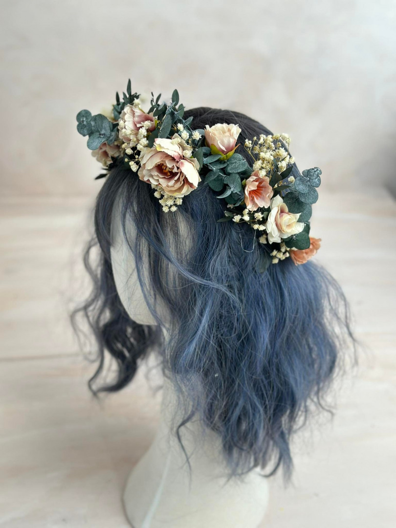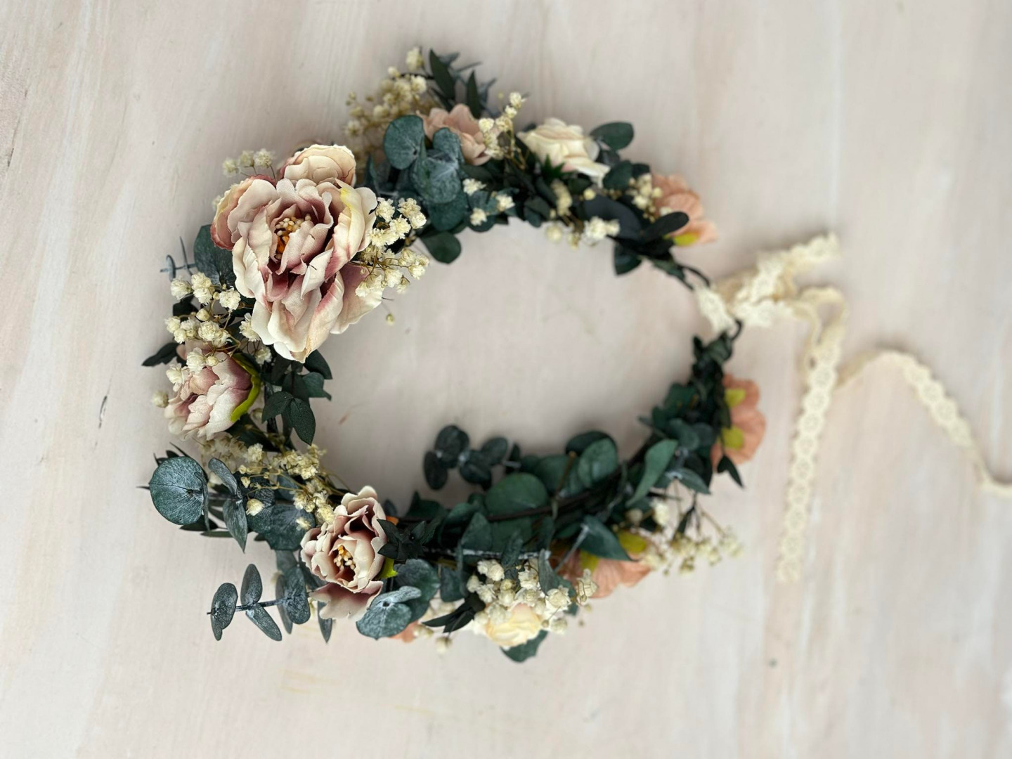 The wreath is suitable for weddings or other celebrations and is made of artificial/textile flowers and grass, leaves, wire, and other trinkets intended for arranging.