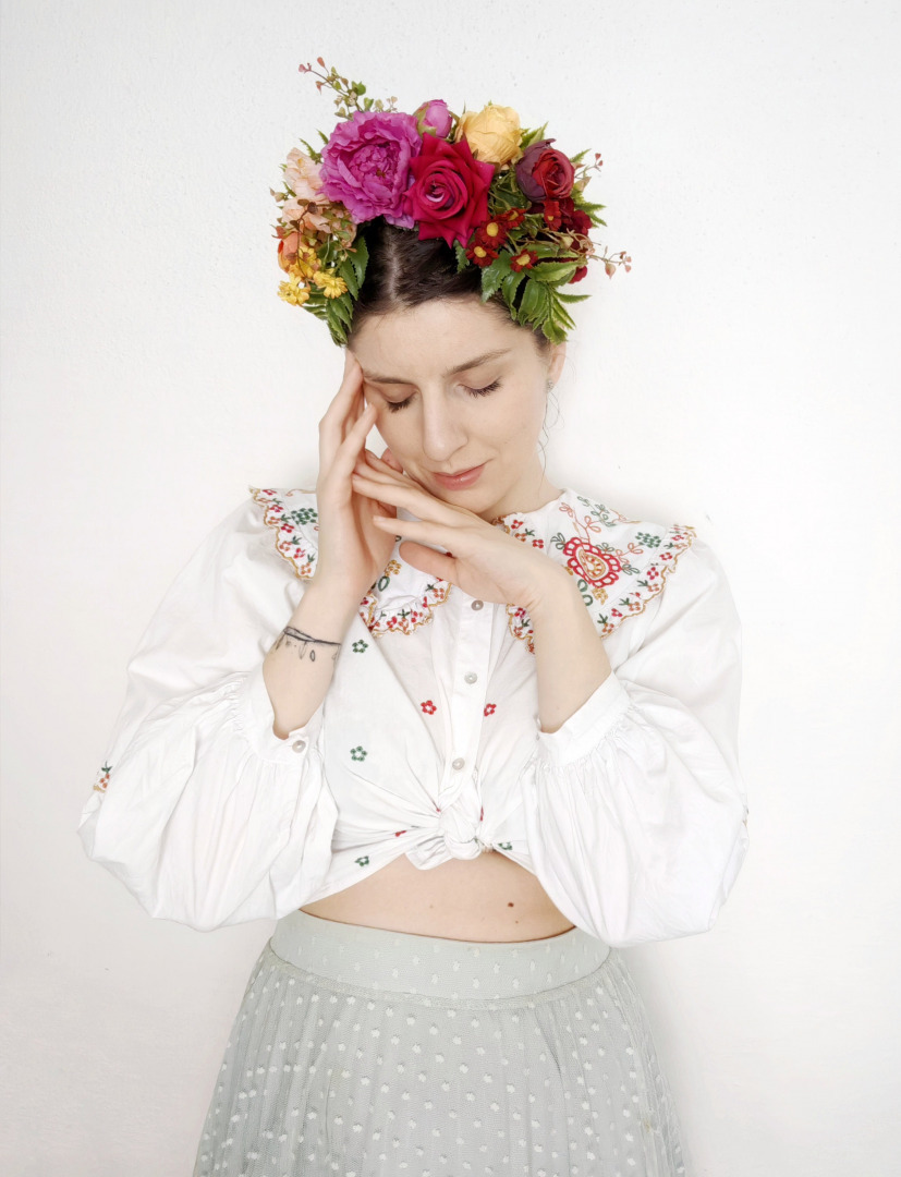 Veľká boho kvetinová čelenka inšpirovaná umelkyňou Fridou.Čelenky sú obojstranné,takže máte dva dizajny v jednom a možnosť nosiť z oboch strán.
