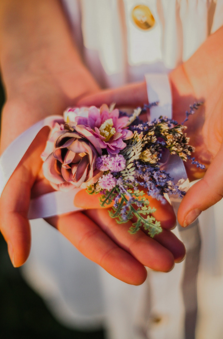 The flower bracelet is made of artificial flowers, preserved flowers, leaves, grass, ribbon and other trinkets used for arranging.
