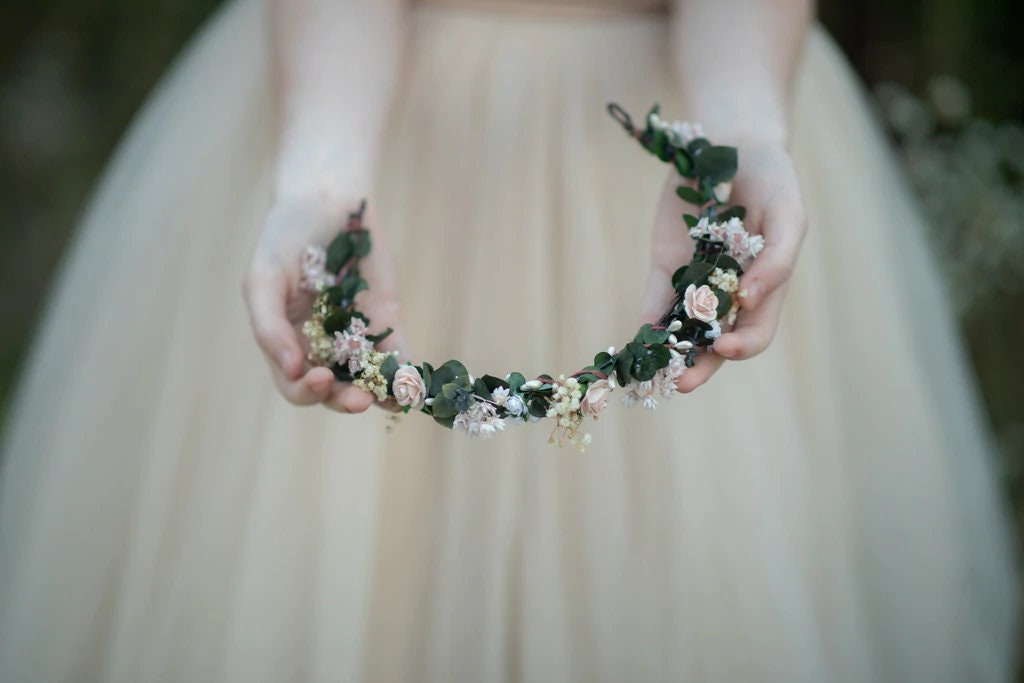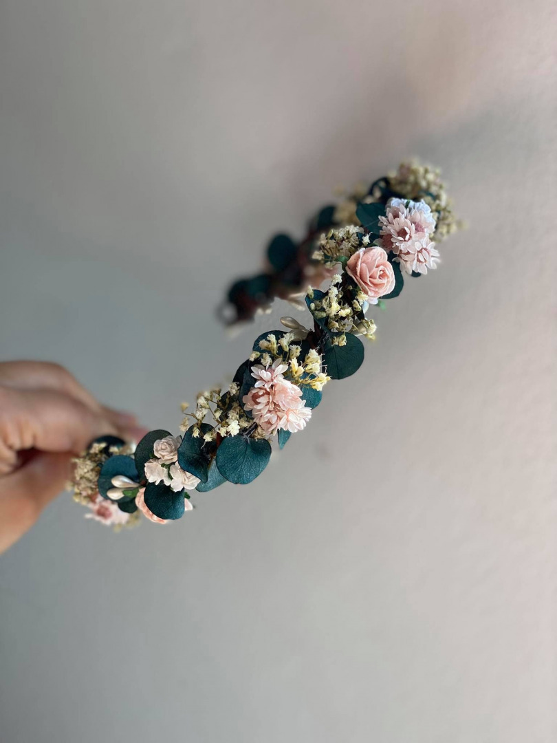 The hair crown is made of artificial/fabric flowers, preserved and dried flowers, preserved eucalyptus leaves, grass, wire and other floristic trinkets used for arranging.